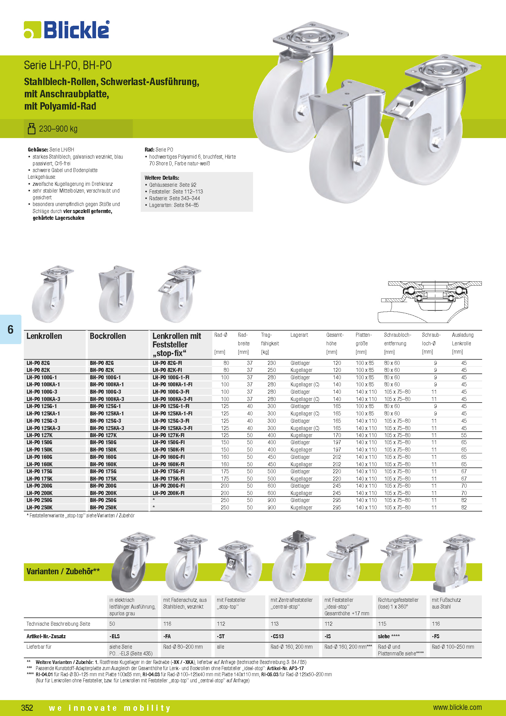 LH-PO, BH-PO Stahlblech-Rollen, Schwerlast-Ausführung, mit Anschraubplatte, mit Polyamid-Rad