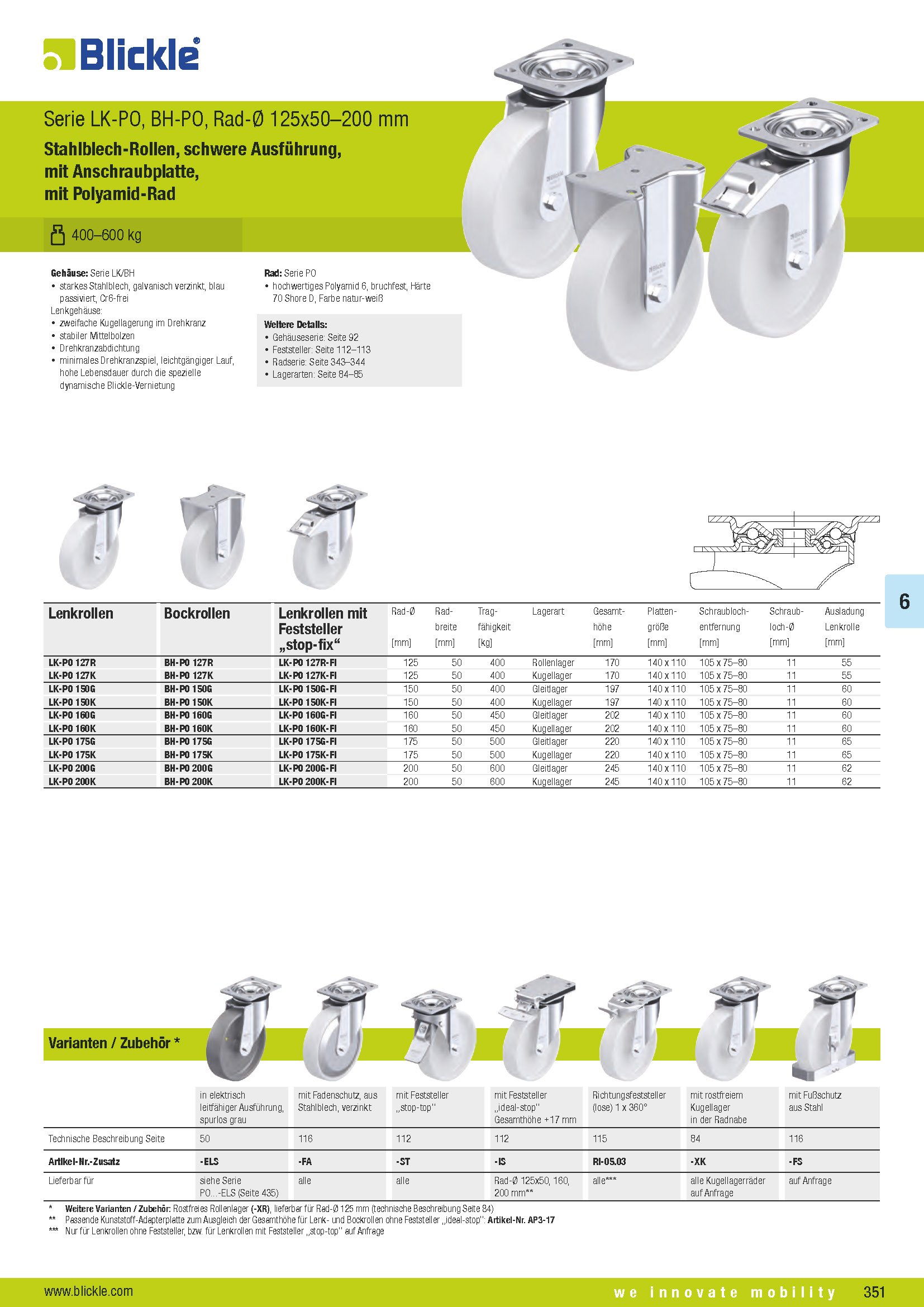 LK-PO, BH-PO, Rad-Ø 125x50–200 mm Stahlblech-Rollen, schwere Ausführung, mit Anschraubplatte, mit Polyamid-Rad