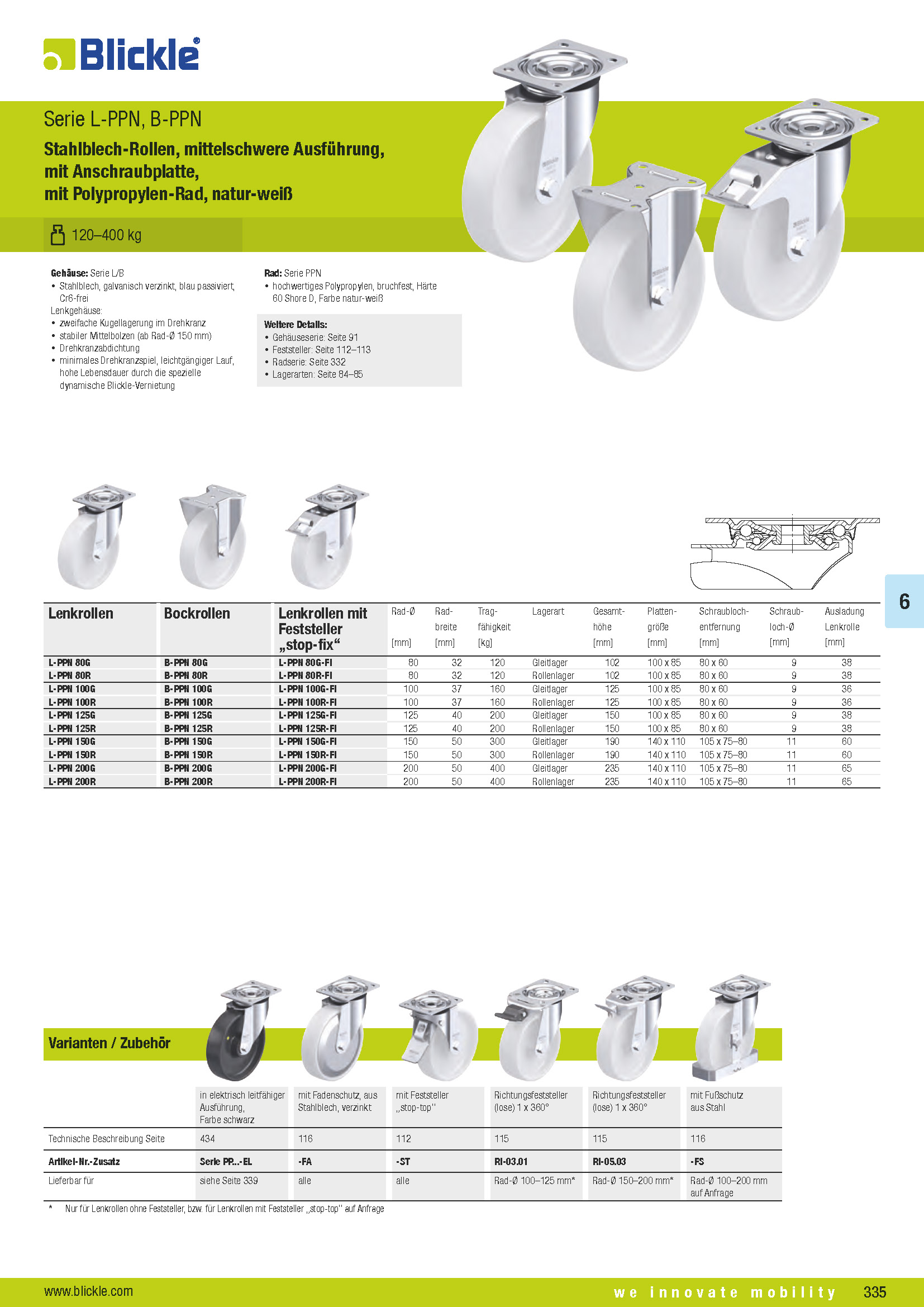 L-PPN, B-PPN Stahlblech-Rollen, mittelschwere Ausführung, mit Anschraubplatte, mit Polypropylen-Rad, natur-weiß