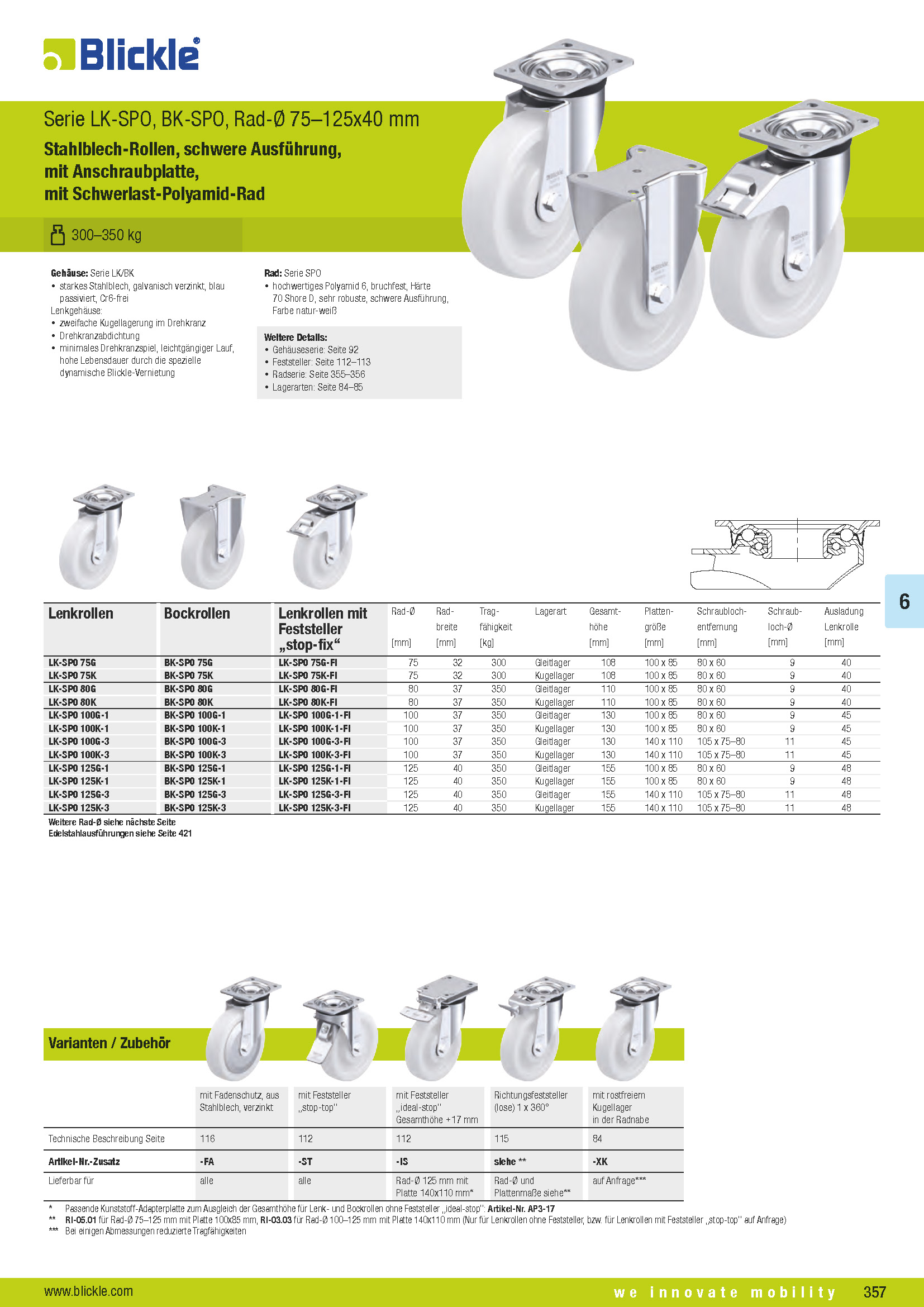 LK-SPO, BK-SPO, wheel Ø 75–125x40 mm Pressed steel castors, heavy-duty design, with top plate, with heavy-duty nylon wheel