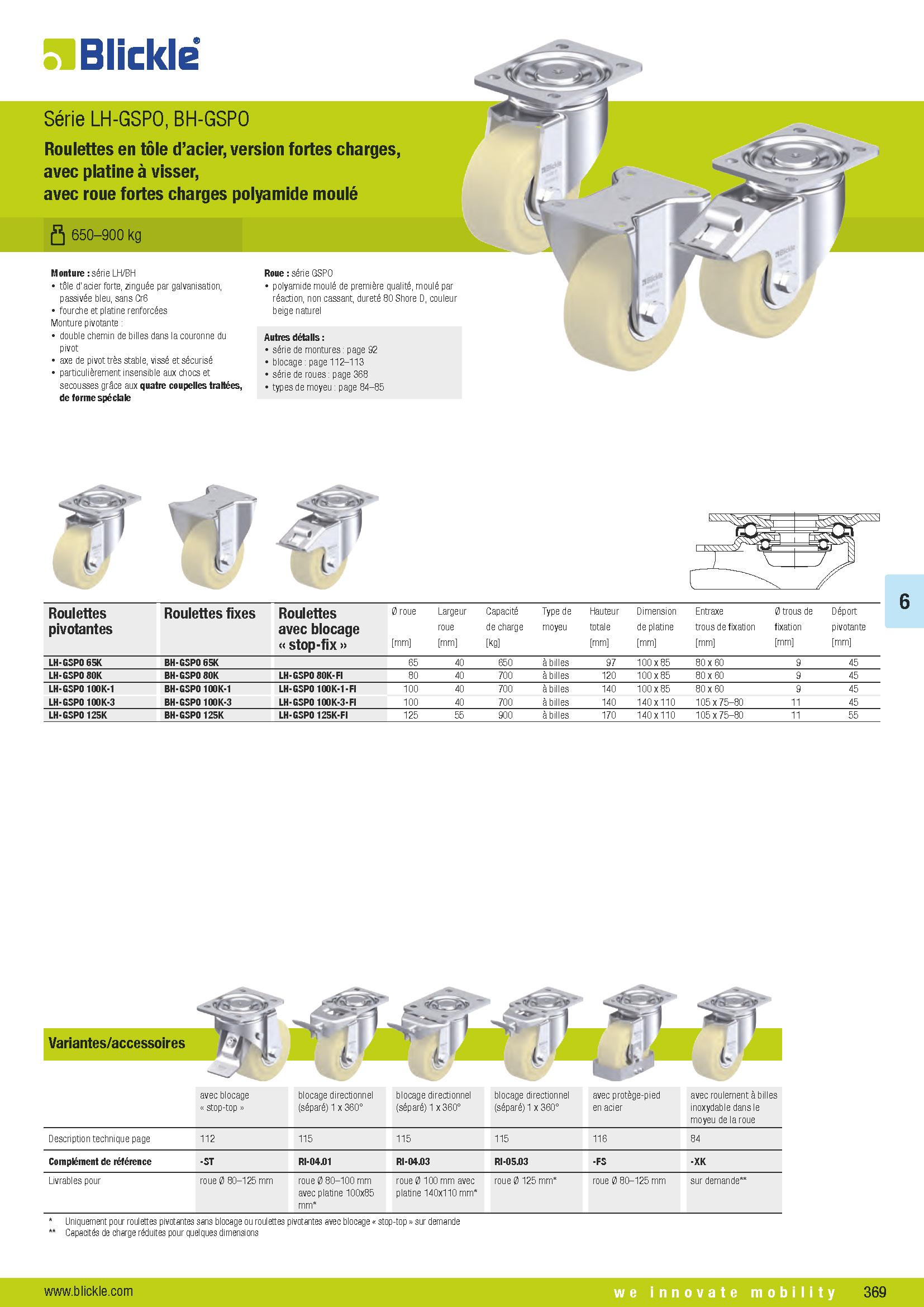 LH-GSPO, BH-GSPO Roulettes en tôle d’acier, version fortes charges, avec platine à visser, avec roue fortes charges polyamide moulé