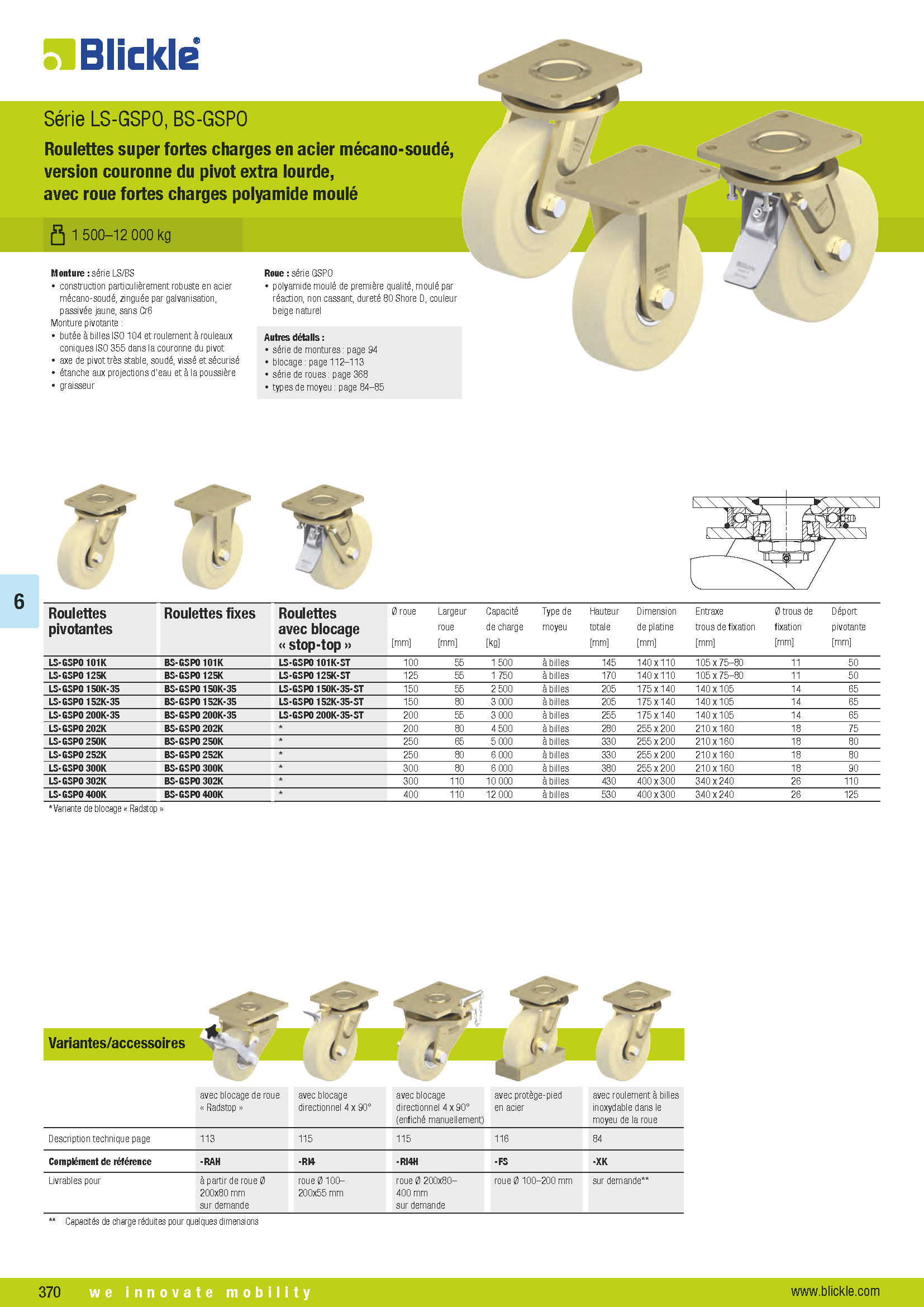 LS-GSPO, BS-GSPO Roulettes super fortes charges en acier mécano-soudé, version couronne du pivot extra lourde, avec roue fortes charges polyamide moulé