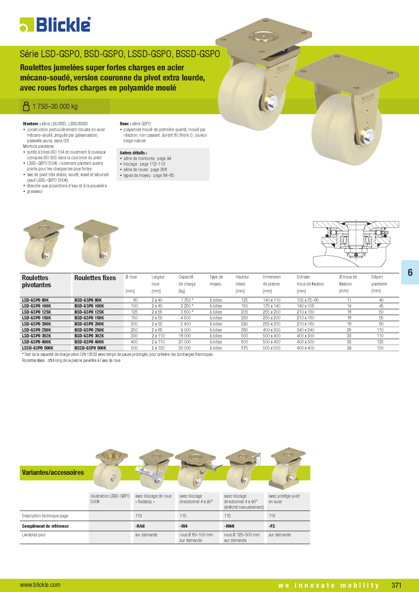 LSD-GSPO, BSD-GSPO, LSSD-GSPO, BSSD-GSPO Roulettes jumelées super fortes charges en acier mécano-soudé, version couronne du pivot extra lourde, avec roues fortes charges en polyamide moulé