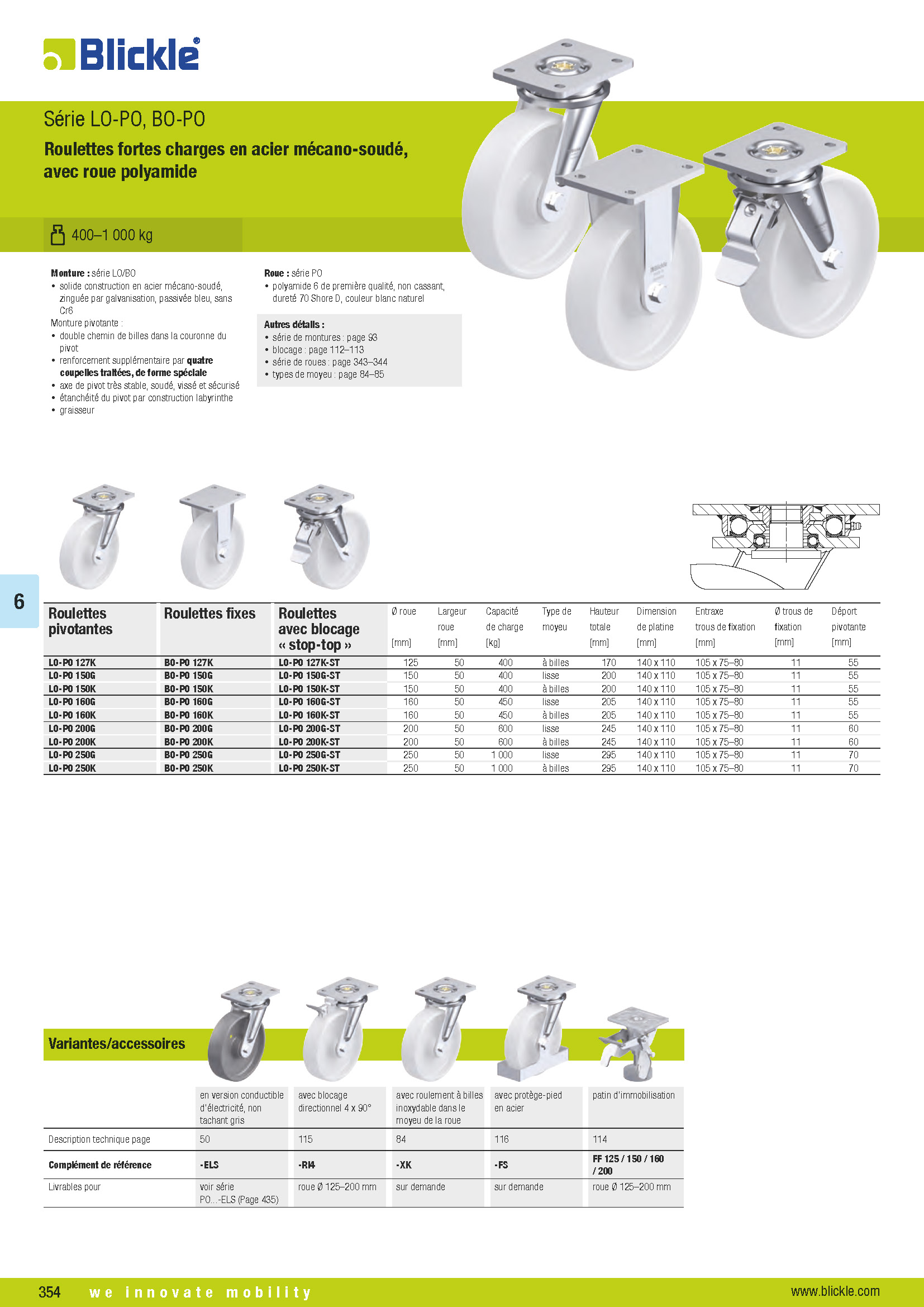 LO-PO, BO-PO Roulettes fortes charges en acier mécano-soudé, avec roue polyamide