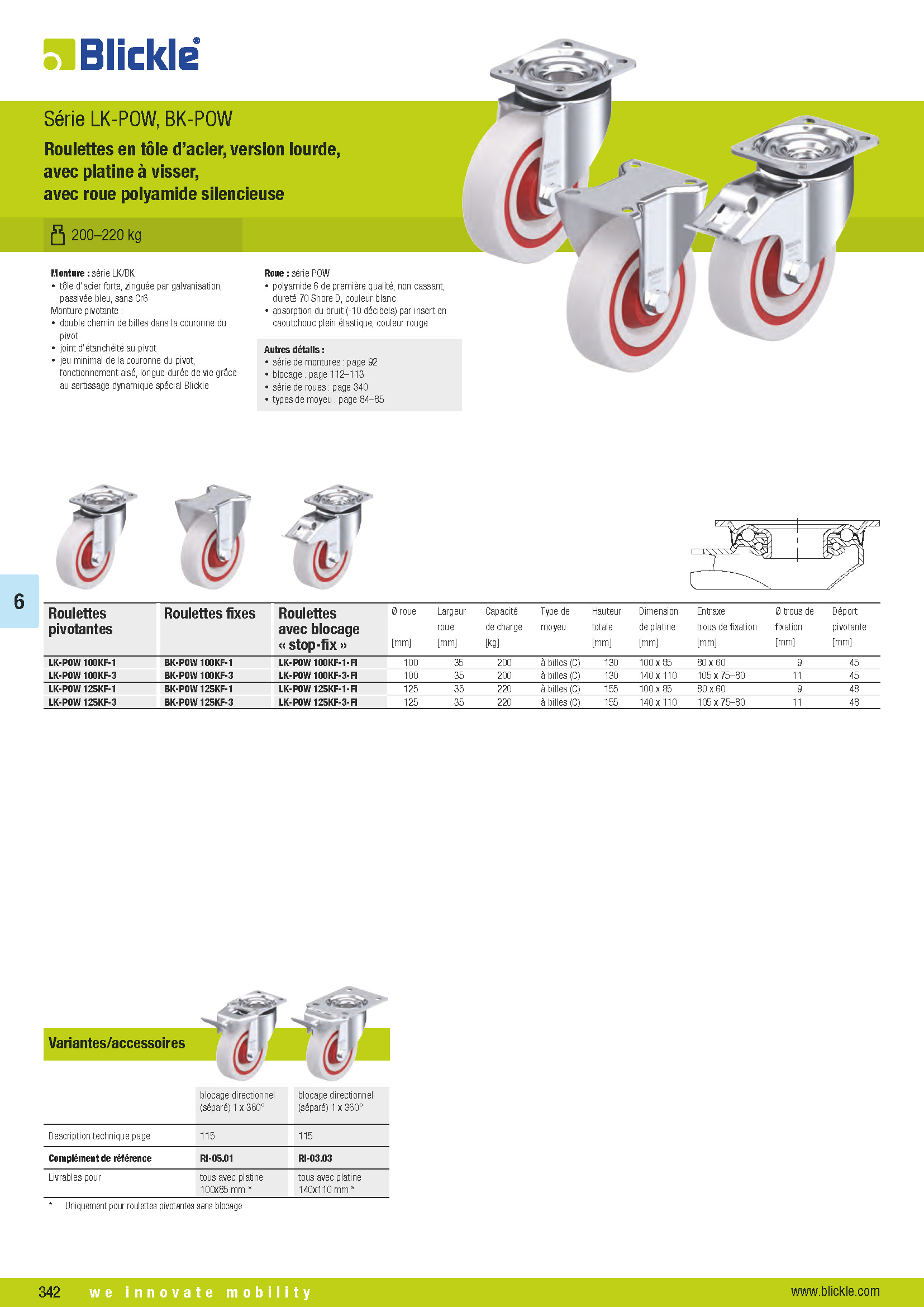 LK-POW, BK-POW Roulettes en tôle d’acier, version lourde, avec platine à visser, avec roue polyamide silencieuse