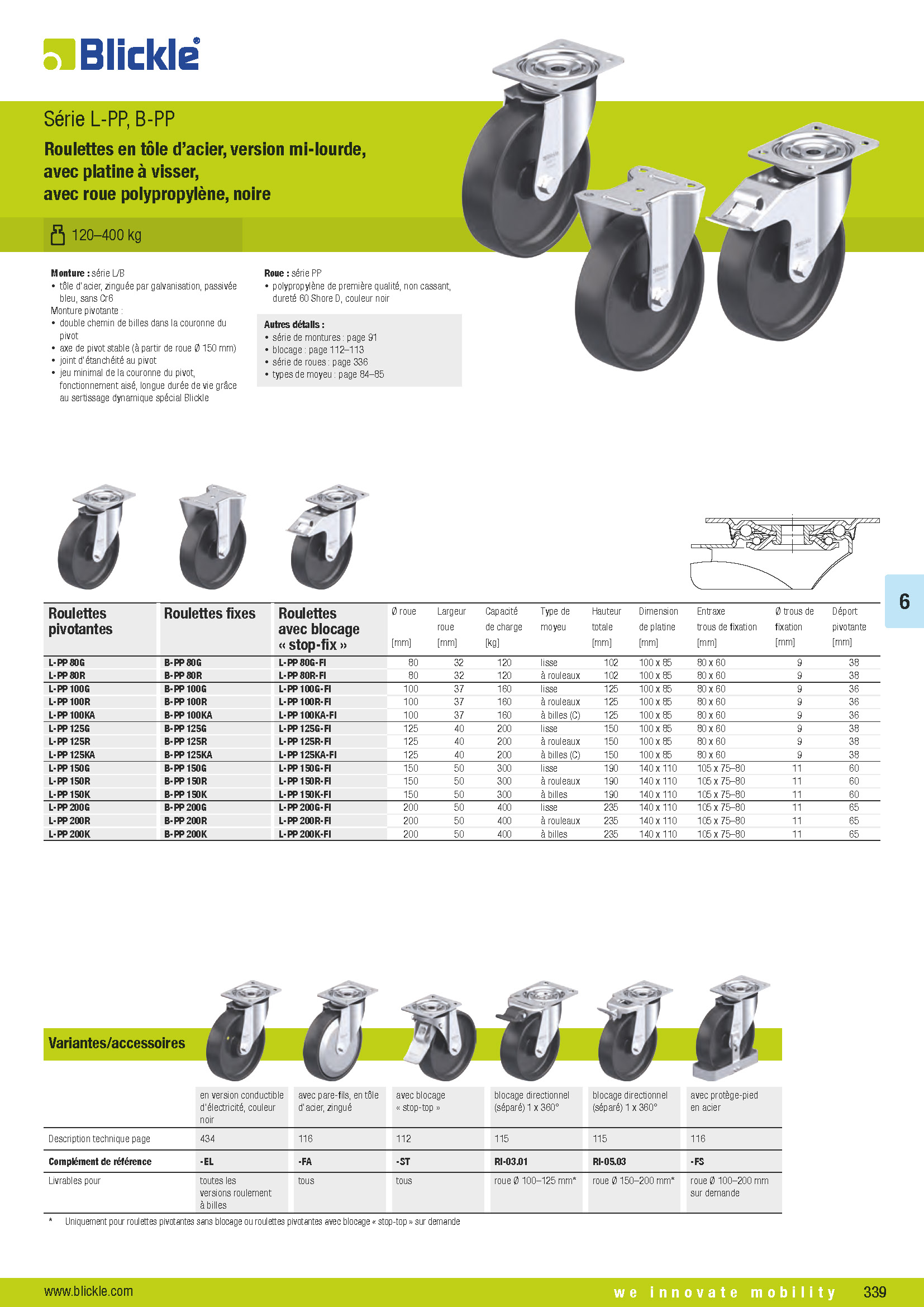 L-PP, B-PP Roulettes en tôle d’acier, version mi-lourde, avec platine à visser, avec roue polypropylène, noir