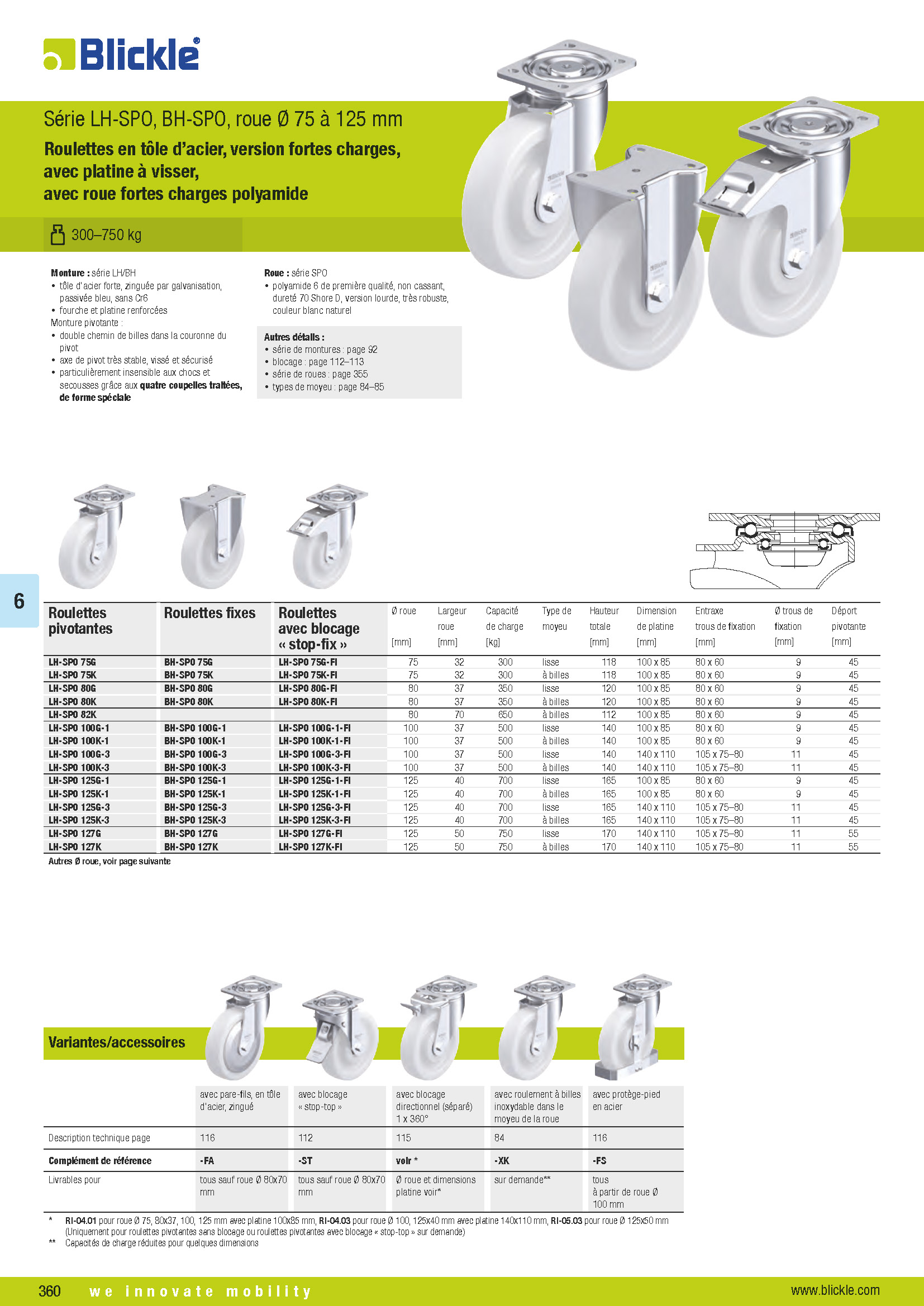LH-SPO, BH-SPO, roue Ø 75 à 125 mm Roulettes en tôle d’acier, version fortes charges, avec platine à visser, avec roue fortes charges polyamide