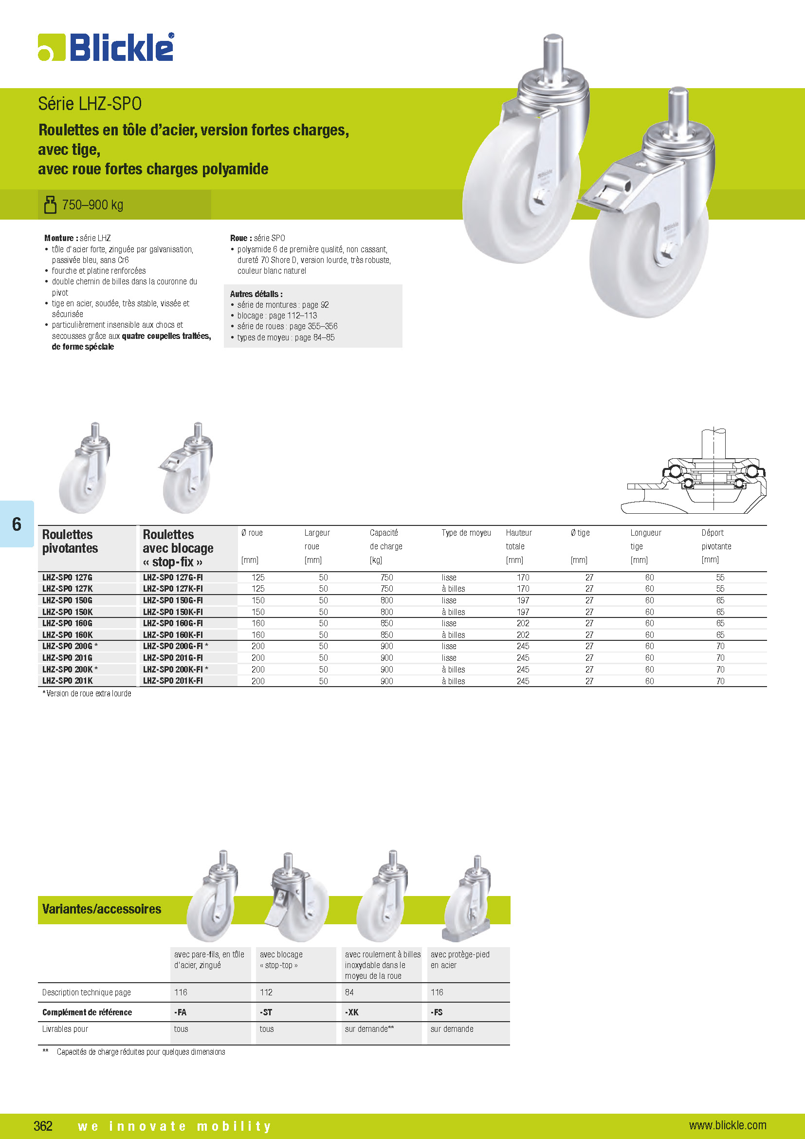 LHZ-SPO Roulettes en tôle d’acier, version fortes charges, avec tige, avec roue fortes charges polyamide