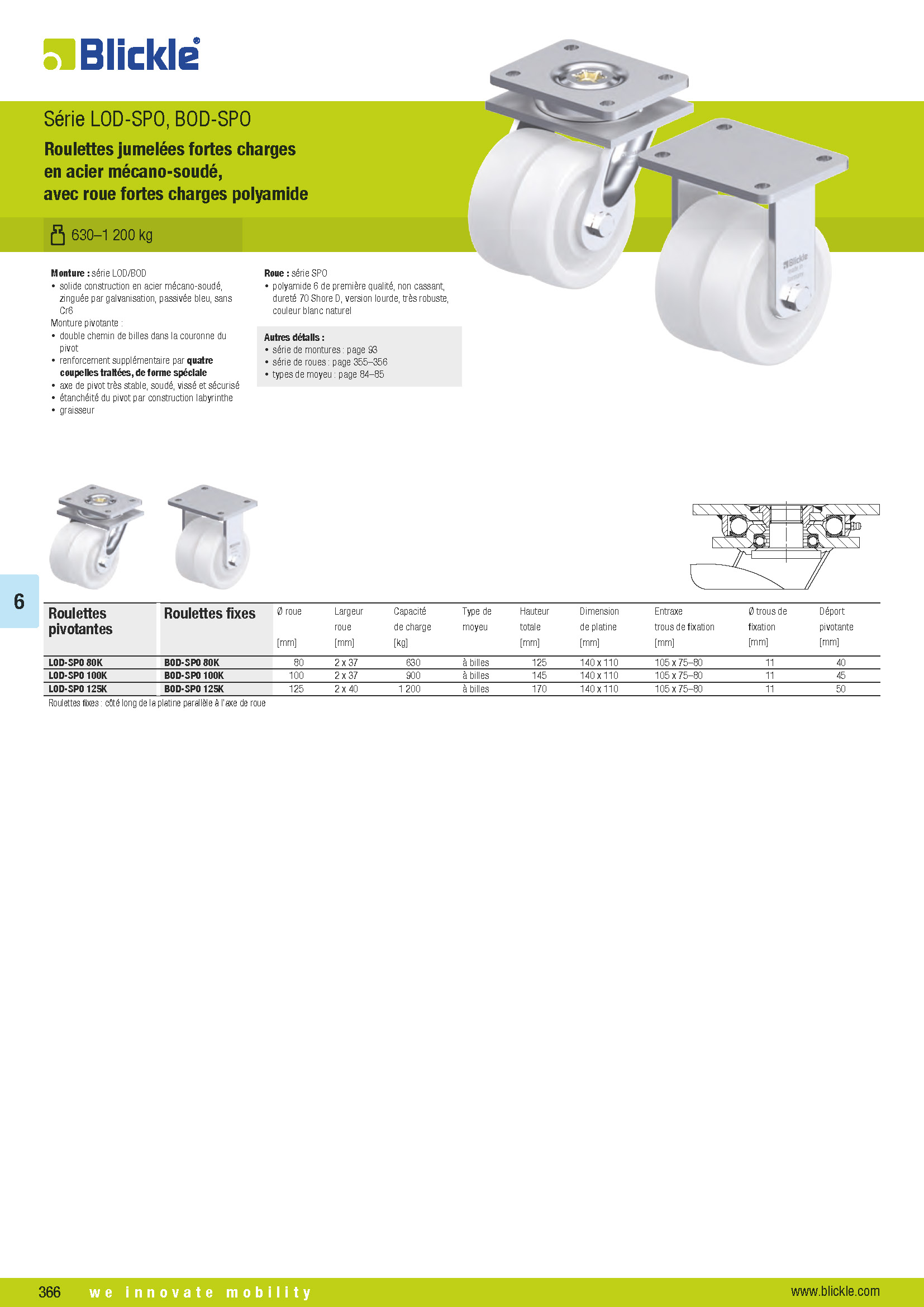 LOD-SPO, BOD-SPO Roulettes jumelées fortes charges en acier mécano-soudé, avec roue fortes charges polyamide