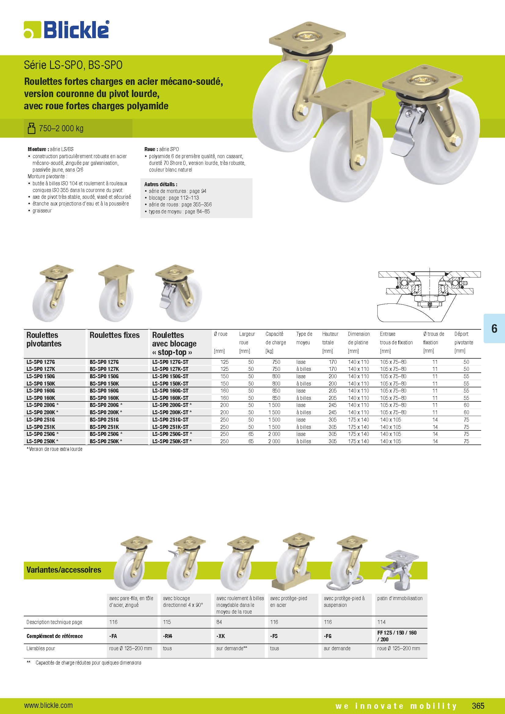 LS-SPO, BS-SPO Roulettes fortes charges en acier mécano-soudé, version couronne du pivot lourde, avec roue fortes charges polyamide