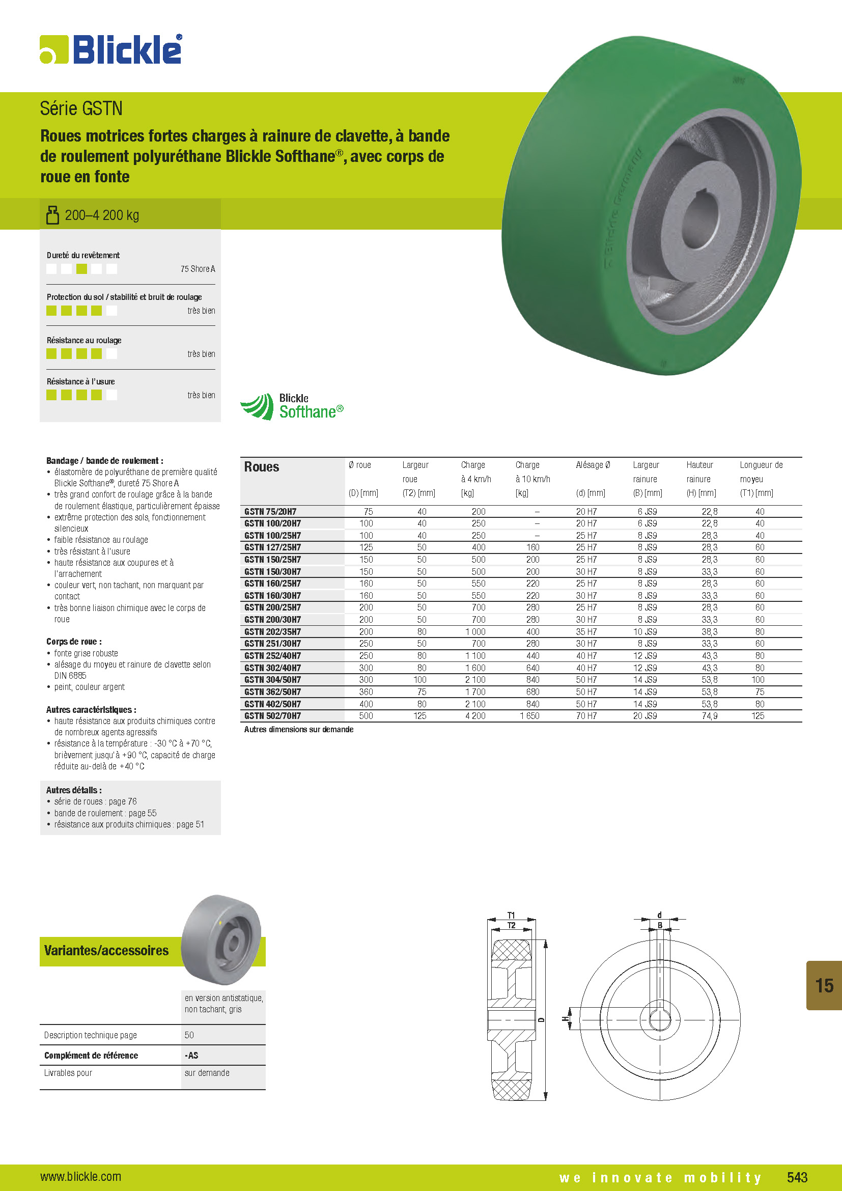 GSTN Roues motrices fortes charges à rainure de clavette, à bande de roulement polyuréthane Blickle Softhane®, avec corps de roue en fonte