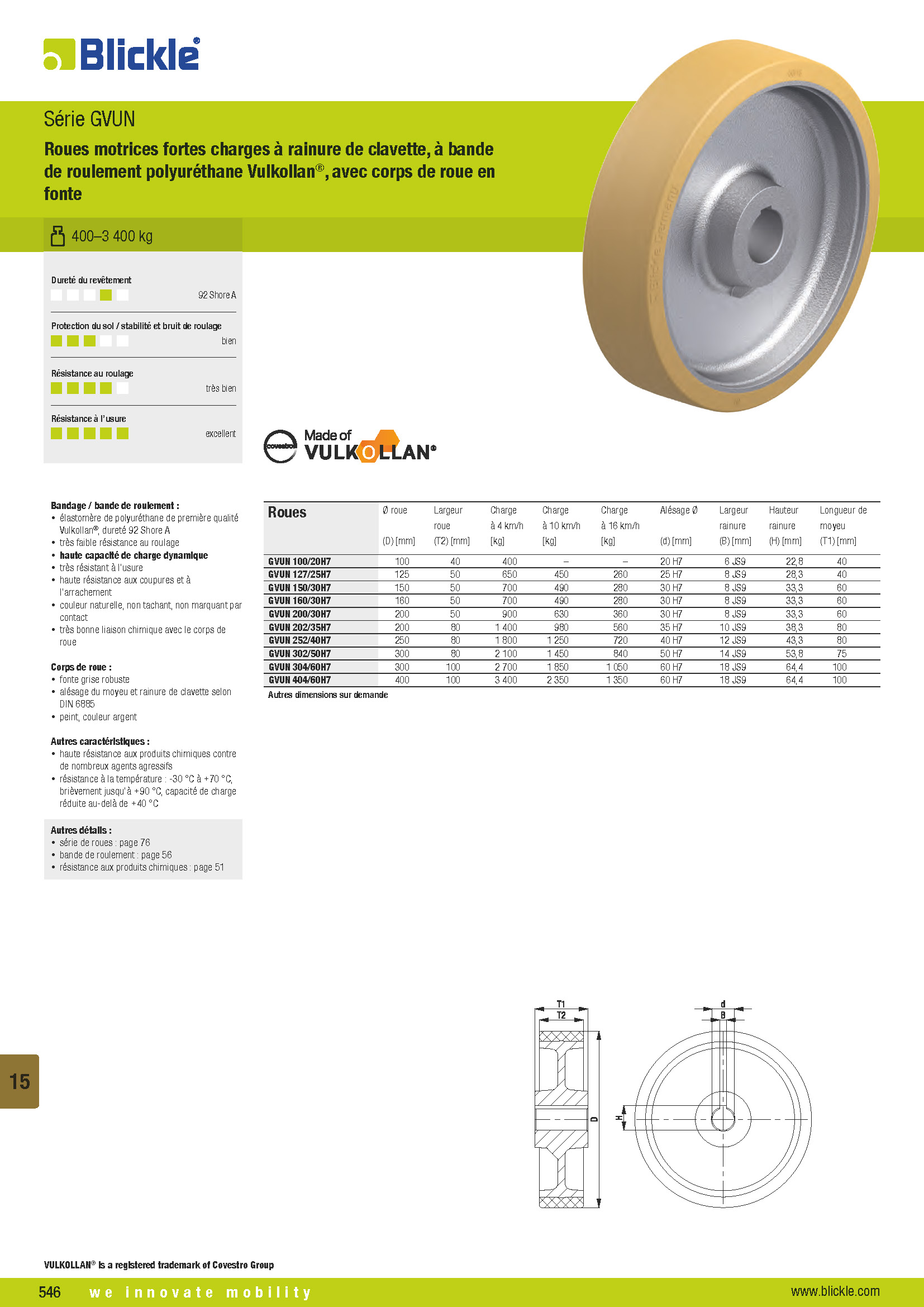 GVUN Roues motrices fortes charges à rainure de clavette, à bande de roulement polyuréthane Vulkollan®, avec corps de roue en fonte