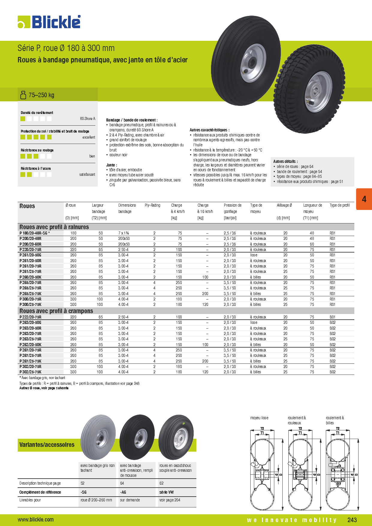 P roue Ø 180 à 300 mm Roues à bandage pneumatique, avec jante en tôle d’acier