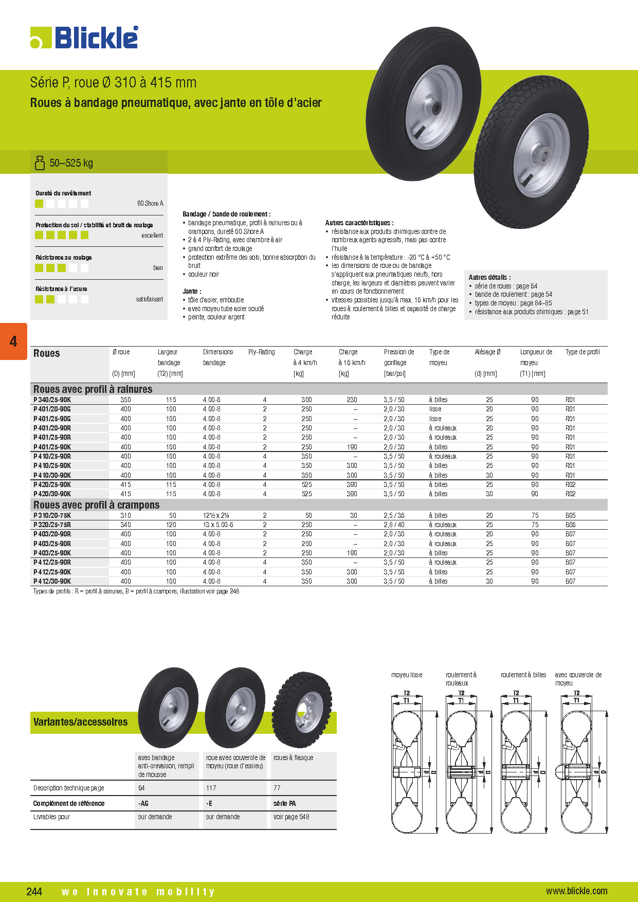 P roue Ø 310 à 415 mm Roues à bandage pneumatique, avec jante en tôle d’acier