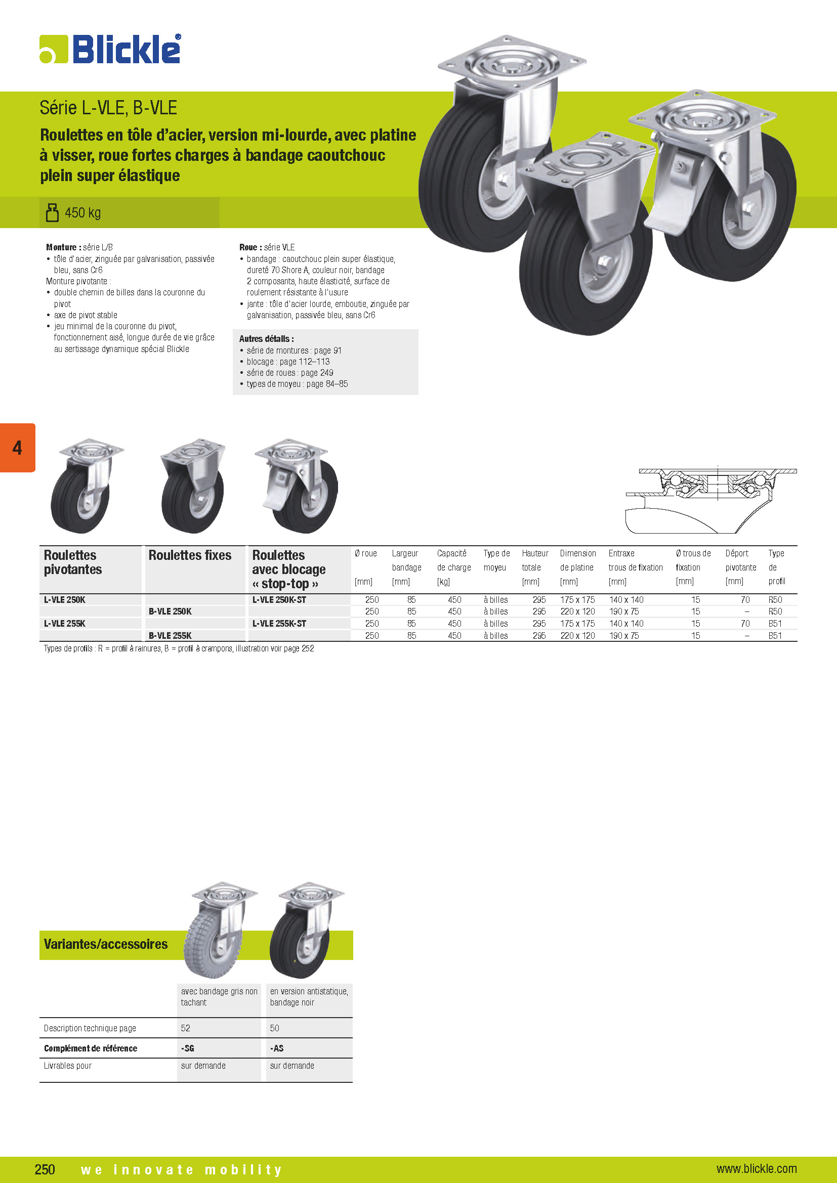 L-VLE, B-VLE Roulettes en tôle d’acier, version mi-lourde, avec platine à visser, roue fortes charges à bandage caoutchouc plein super élastique