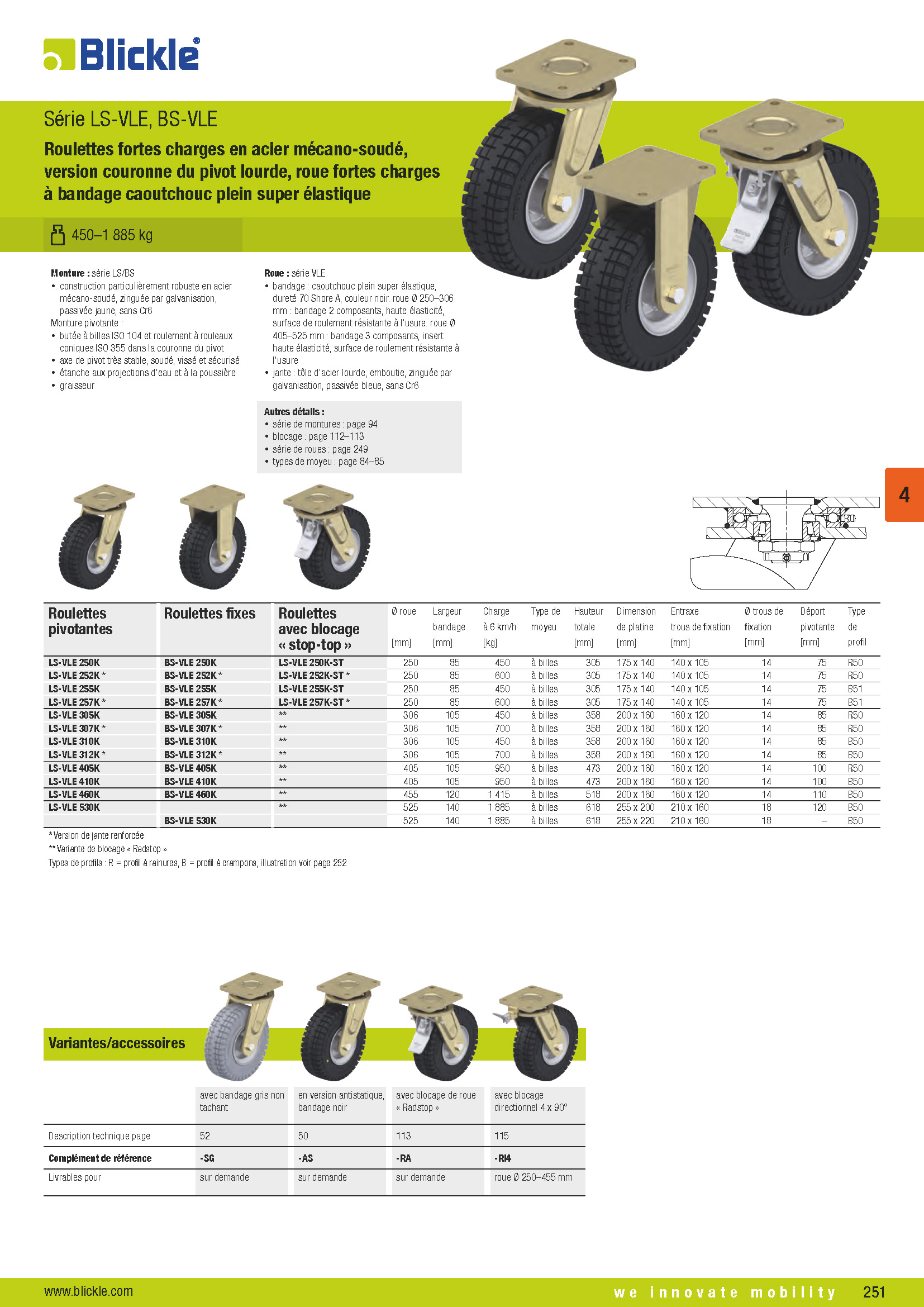 LS-VLE, BS-VLE Roulettes fortes charges en acier mécano-soudé, version couronne du pivot lourde, roue fortes charges à bandage caoutchouc plein super élastique