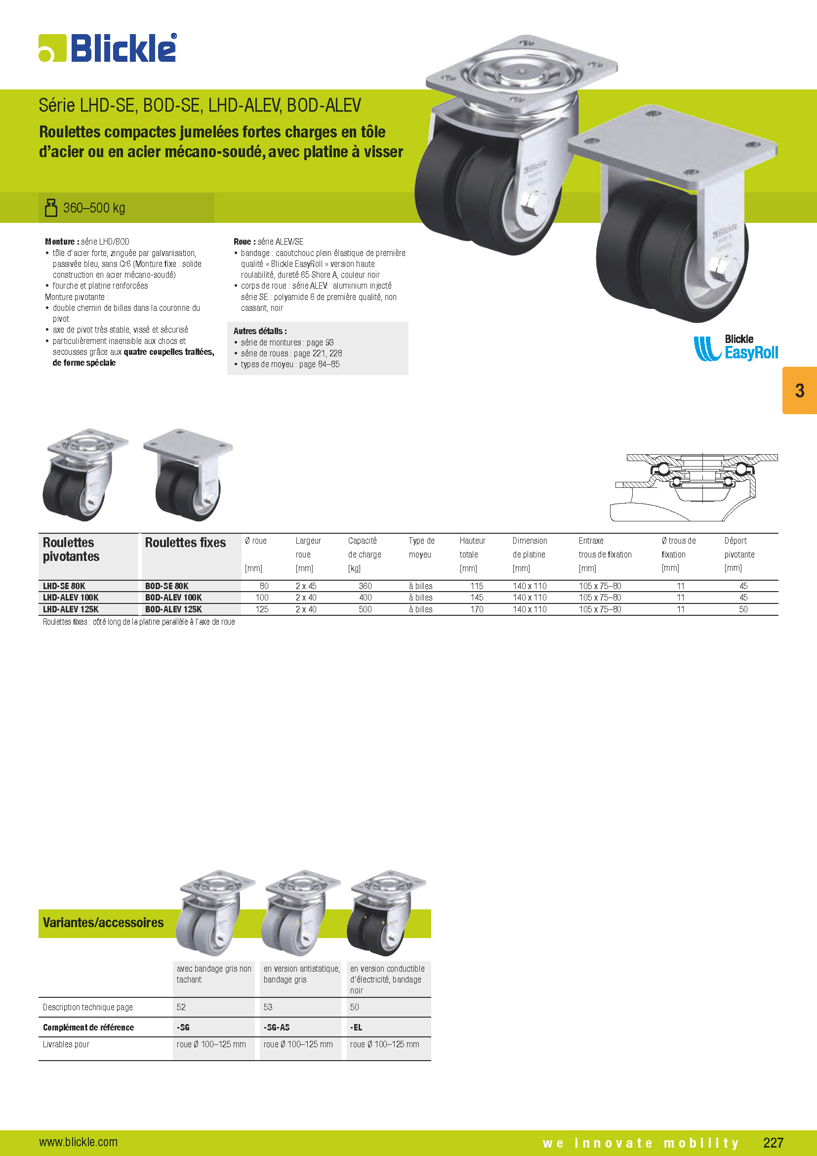 LHD-SE, BOD-SE, LHD-ALEV, BOD-ALEV Roulettes compactes jumelées fortes charges en tôle d’acier ou en acier mécano-soudé, avec platine à visser