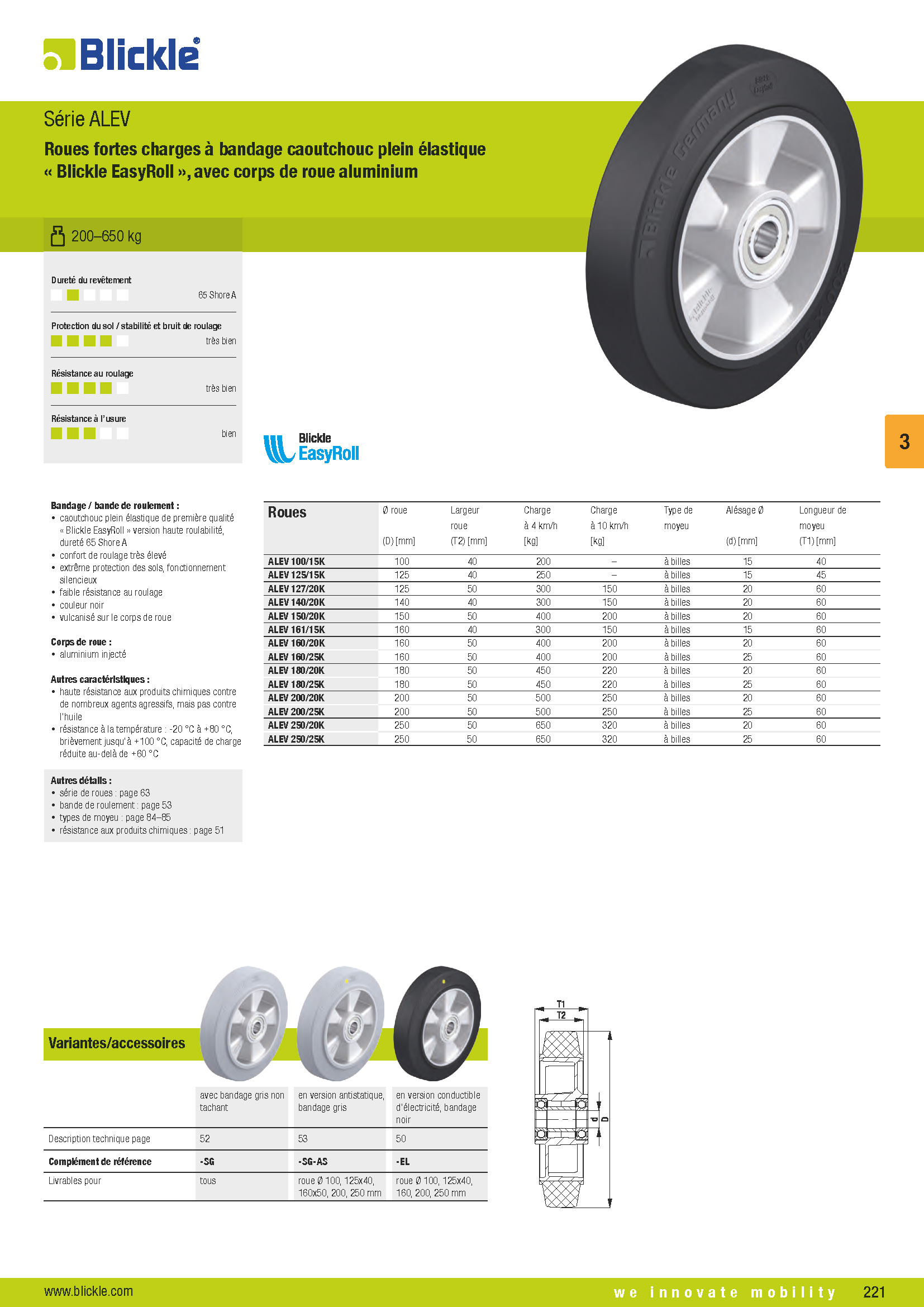 ALEV Roues fortes charges à bandage caoutchouc plein élastique « Blickle EasyRoll », avec corps de roue aluminium