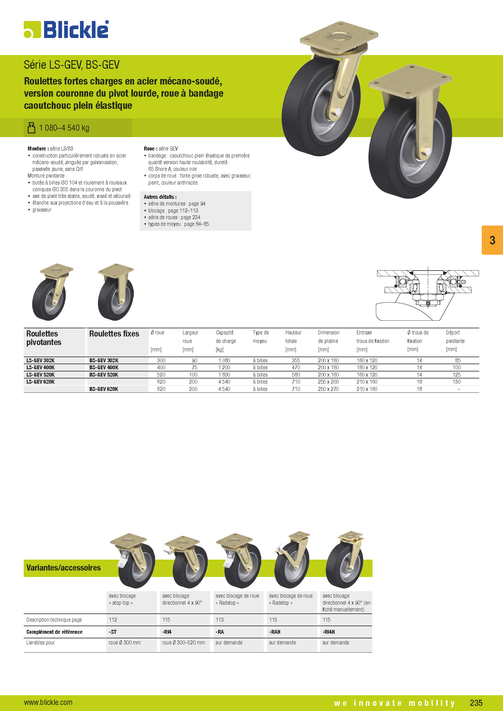 LS-GEV, BS-GEV Roulettes fortes charges en acier mécano-soudé, version couronne du pivot lourde, roue à bandage caoutchouc plein élastique