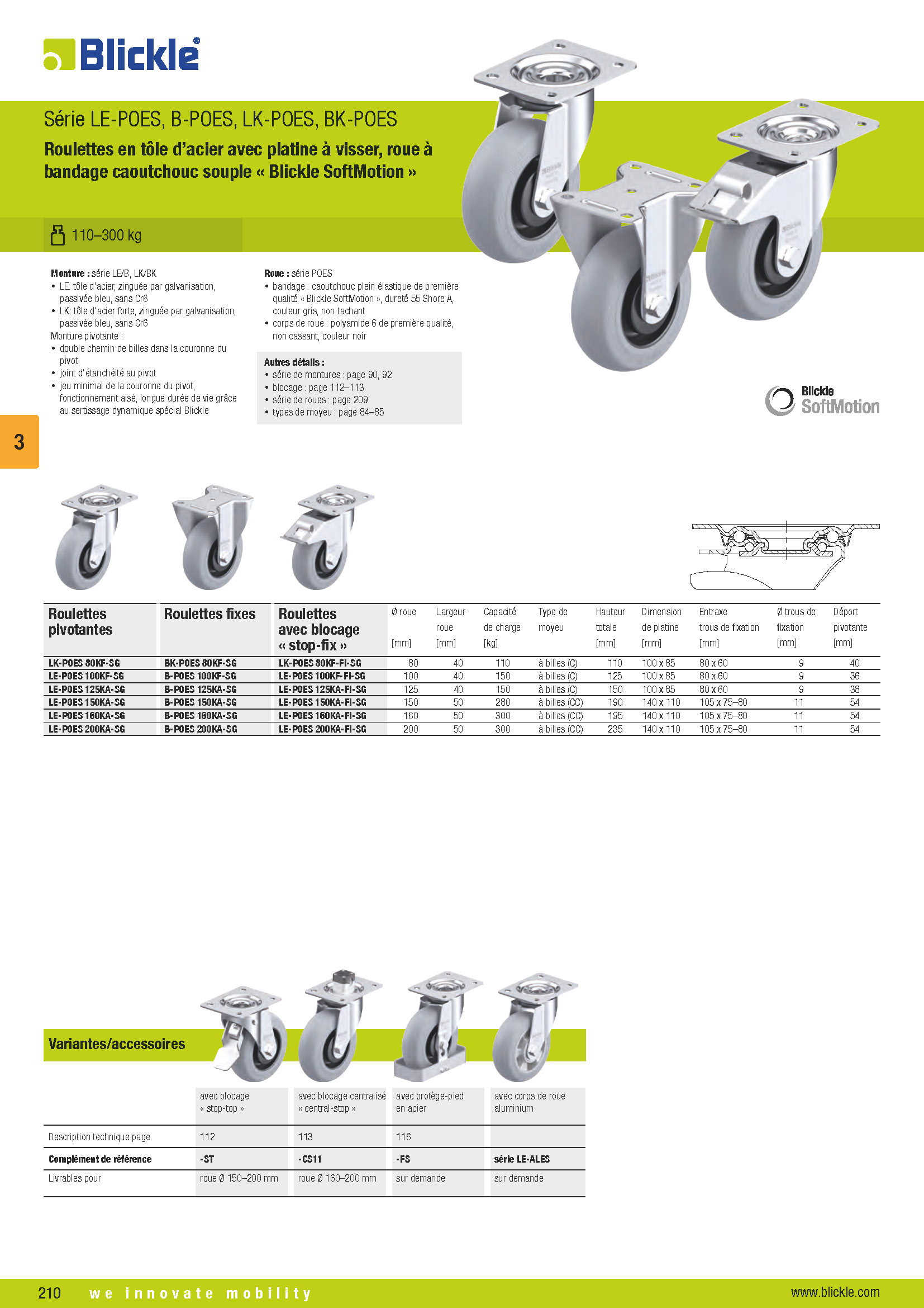 LE-POES, B-POES, LK-POES, BK-POES Roulettes en tôle d’acier avec platine à visser, roue à bandage caoutchouc souple « Blickle SoftMotion »