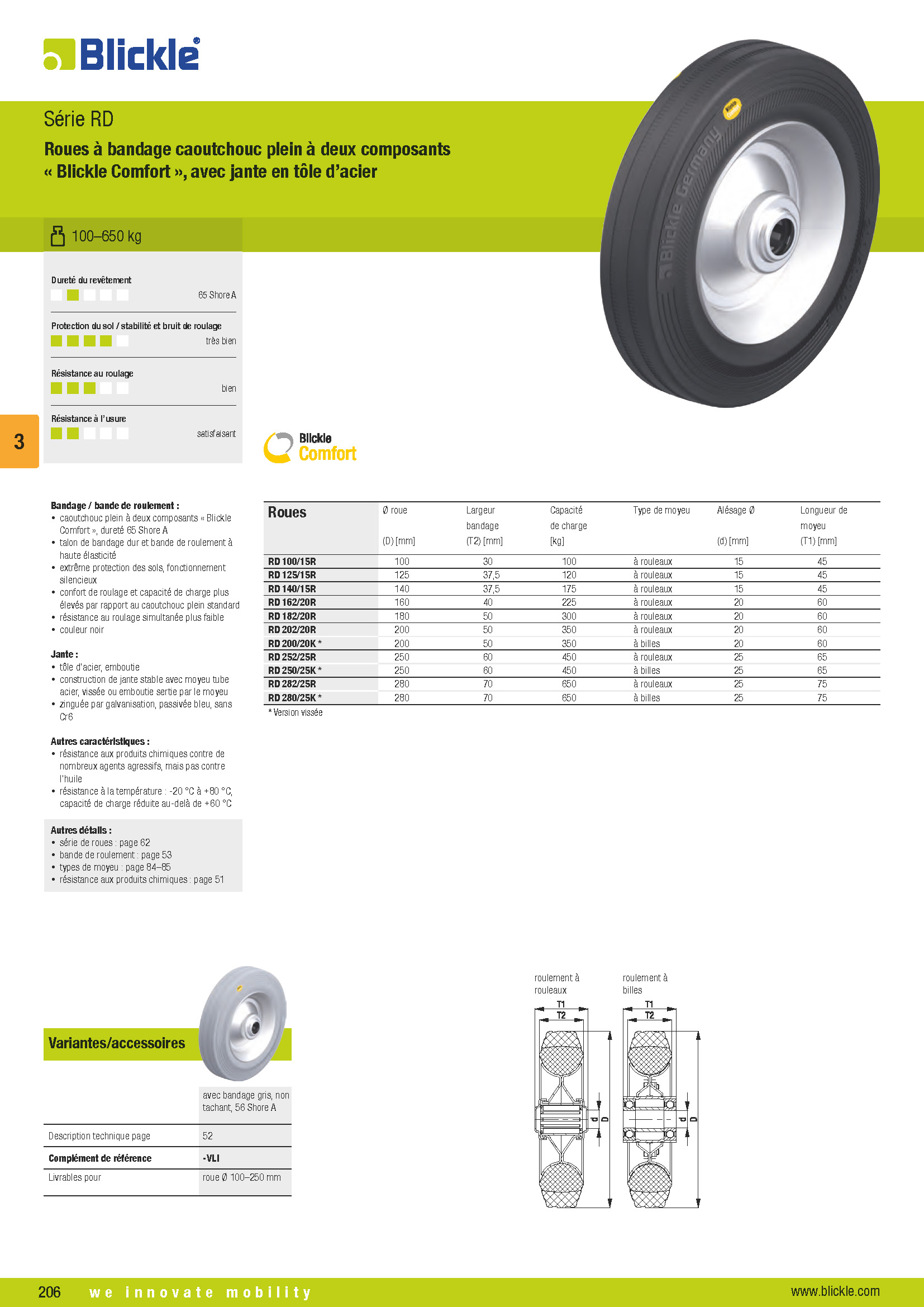 RD Roues à bandage caoutchouc plein à deux composants « Blickle Comfort », avec jante en tôle d’acier