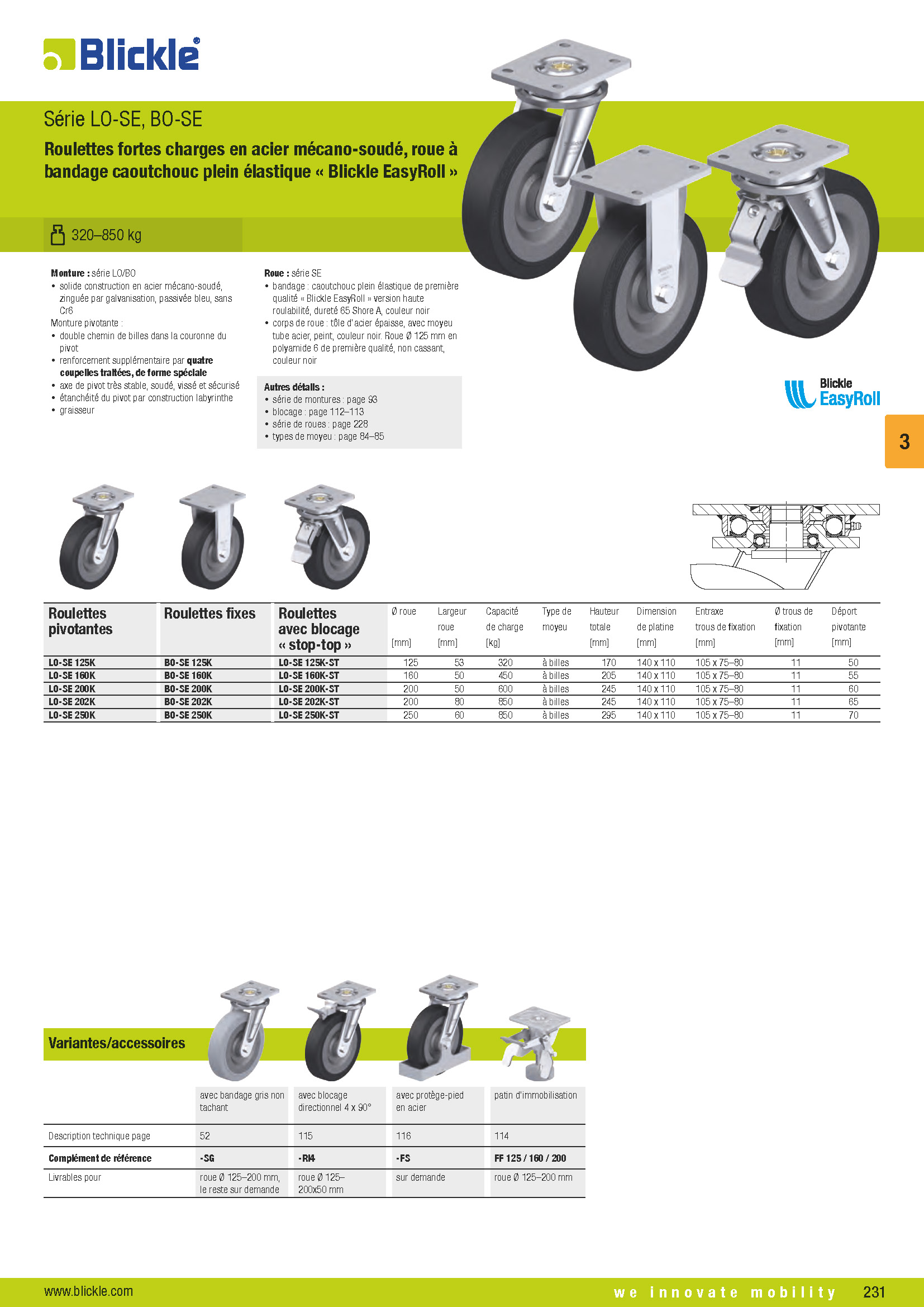 LO-SE, BO-SE Roulettes fortes charges en acier mécano-soudé, roue à bandage caoutchouc plein élastique « Blickle EasyRoll »