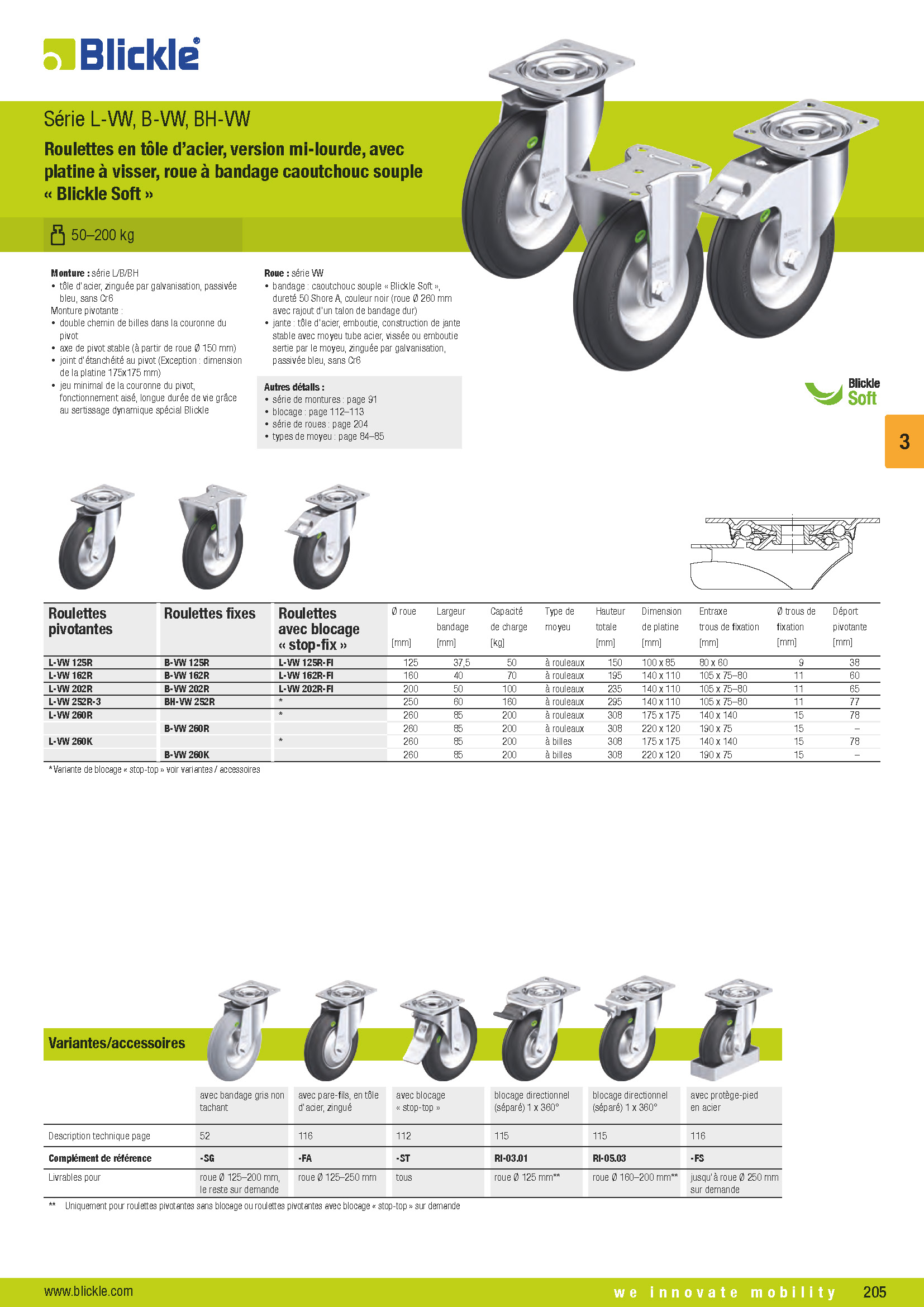 L-VW, B-VW, BH-VW Roulettes en tôle d’acier, version mi-lourde, avec platine à visser, roue à bandage caoutchouc souple « Blickle Soft »