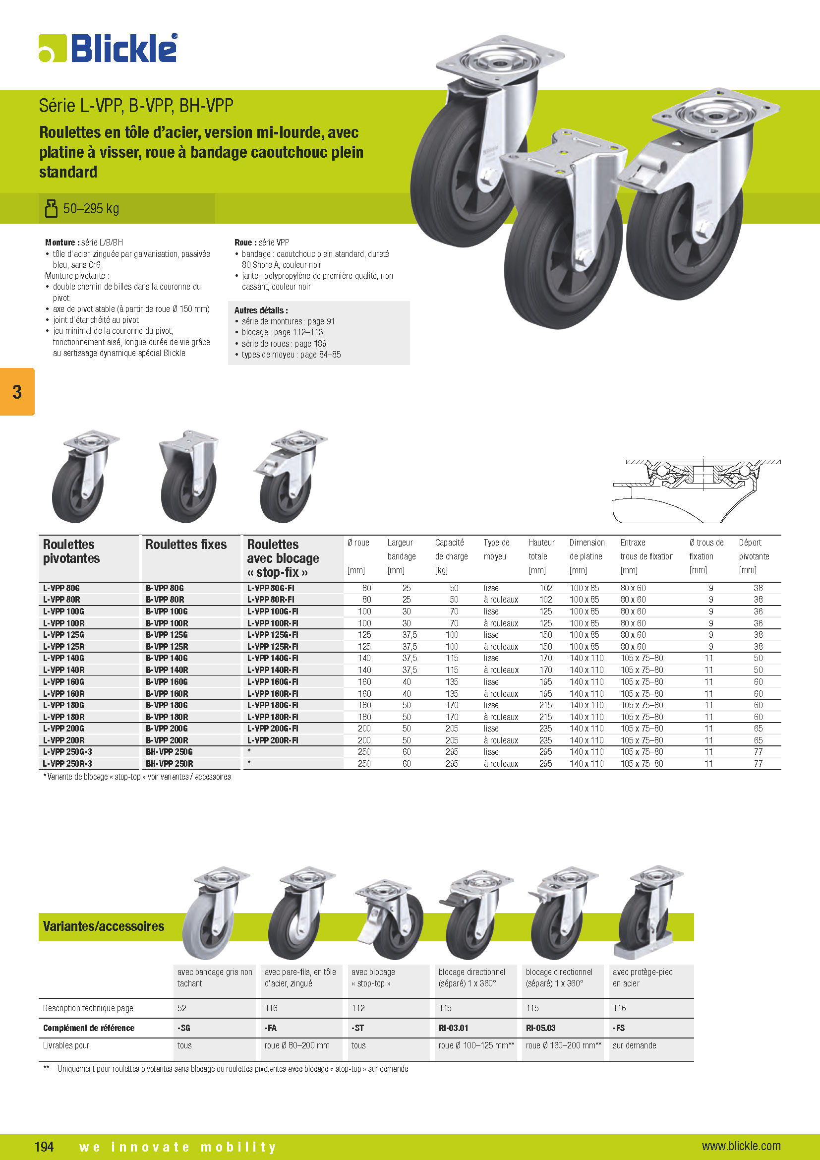 L-VPP, B-VPP, BH-VPP Roulettes en tôle d’acier, version mi-lourde, avec platine à visser, roue à bandage caoutchouc plein standard