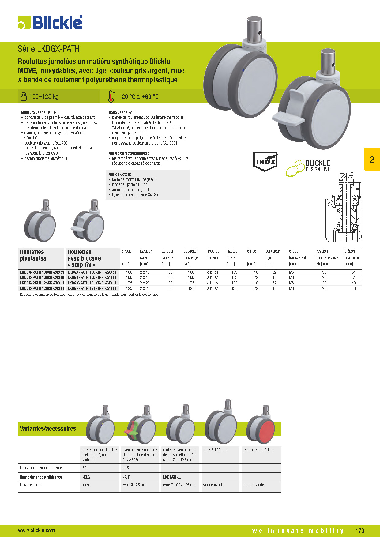 LKDGX-PATH Roulettes jumelées en matière synthétique Blickle MOVE, inoxydables, avec tige, couleur gris argent, roue à bande de roulement polyuréthane thermoplastique
