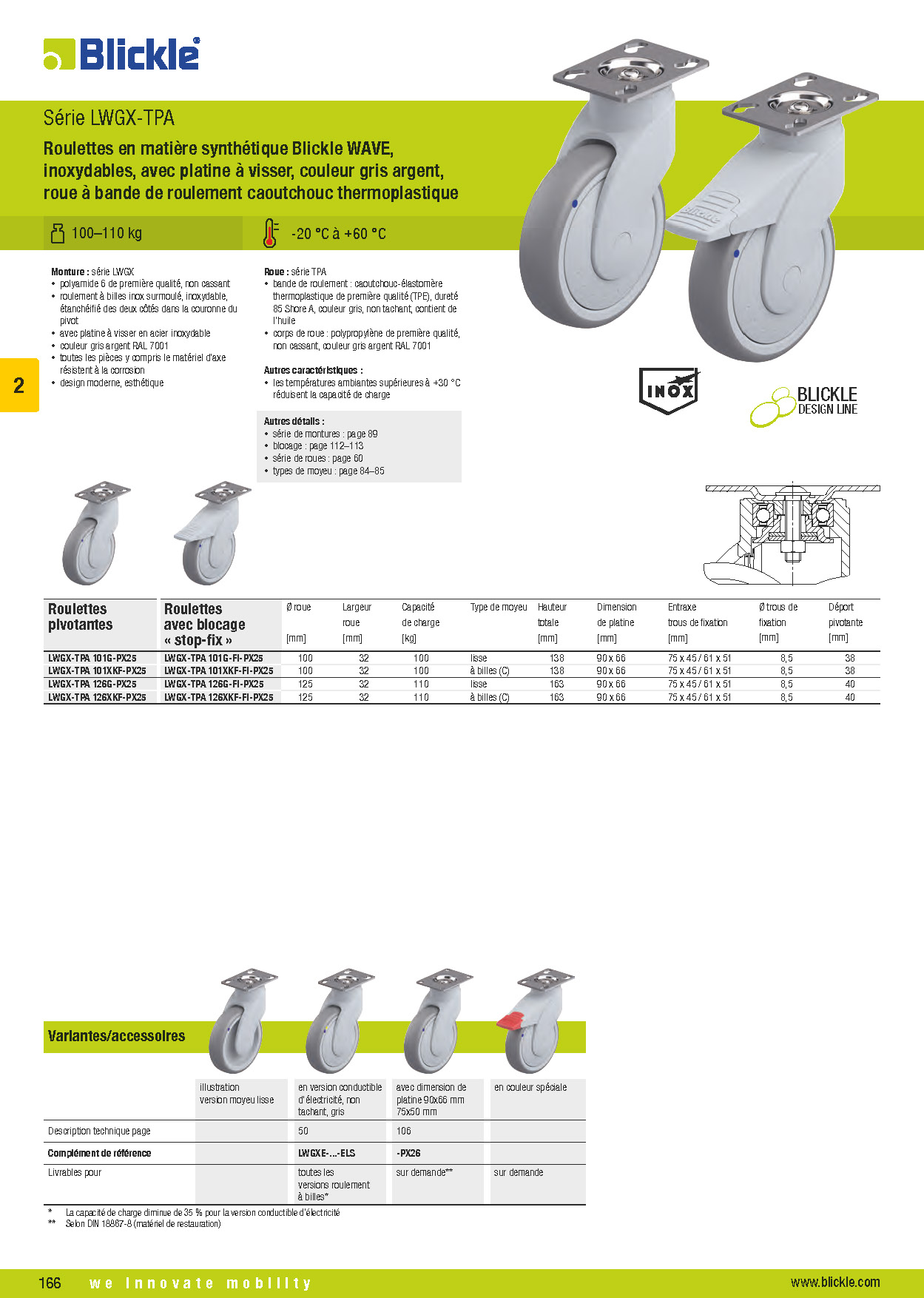 LWGX-TPA Roulettes en matière synthétique Blickle WAVE, inoxydables, avec platine à visser, couleur gris argent, roue à bande de roulement caoutchouc thermoplastique