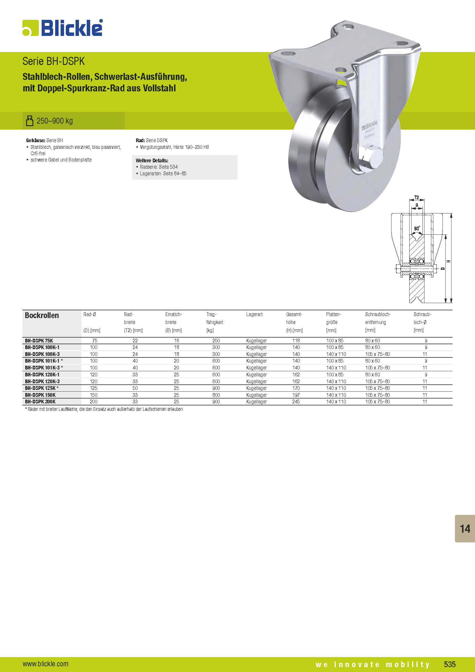 BH-DSPK Stahlblech-Rollen, Schwerlast-Ausführung, mit Doppel-Spurkranz-Rad aus Vollstahl