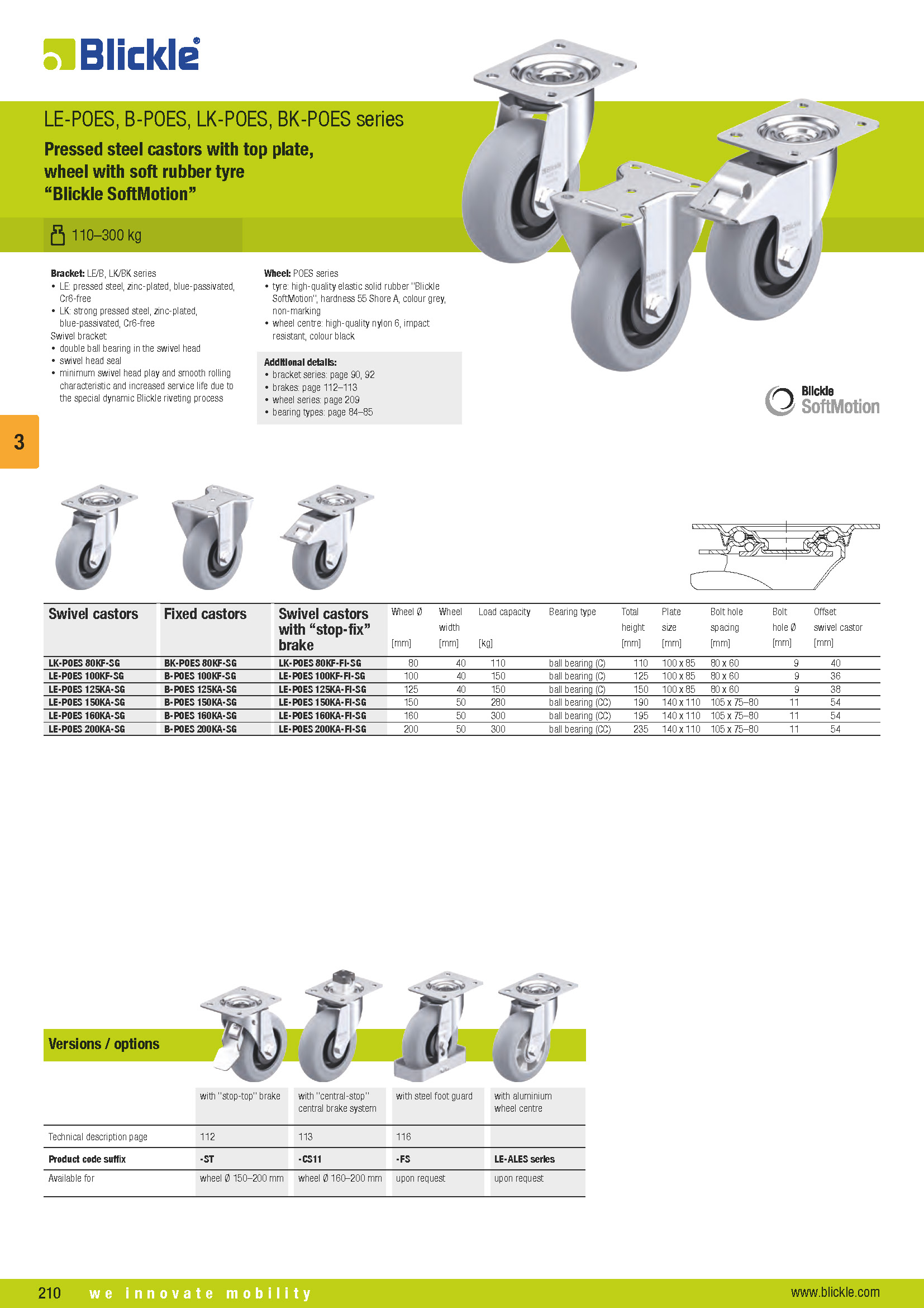 LE-POES, B-POES, LK-POES, BK-POES Pressed steel castors with top plate, wheel with soft rubber tyre “Blickle SoftMotion”