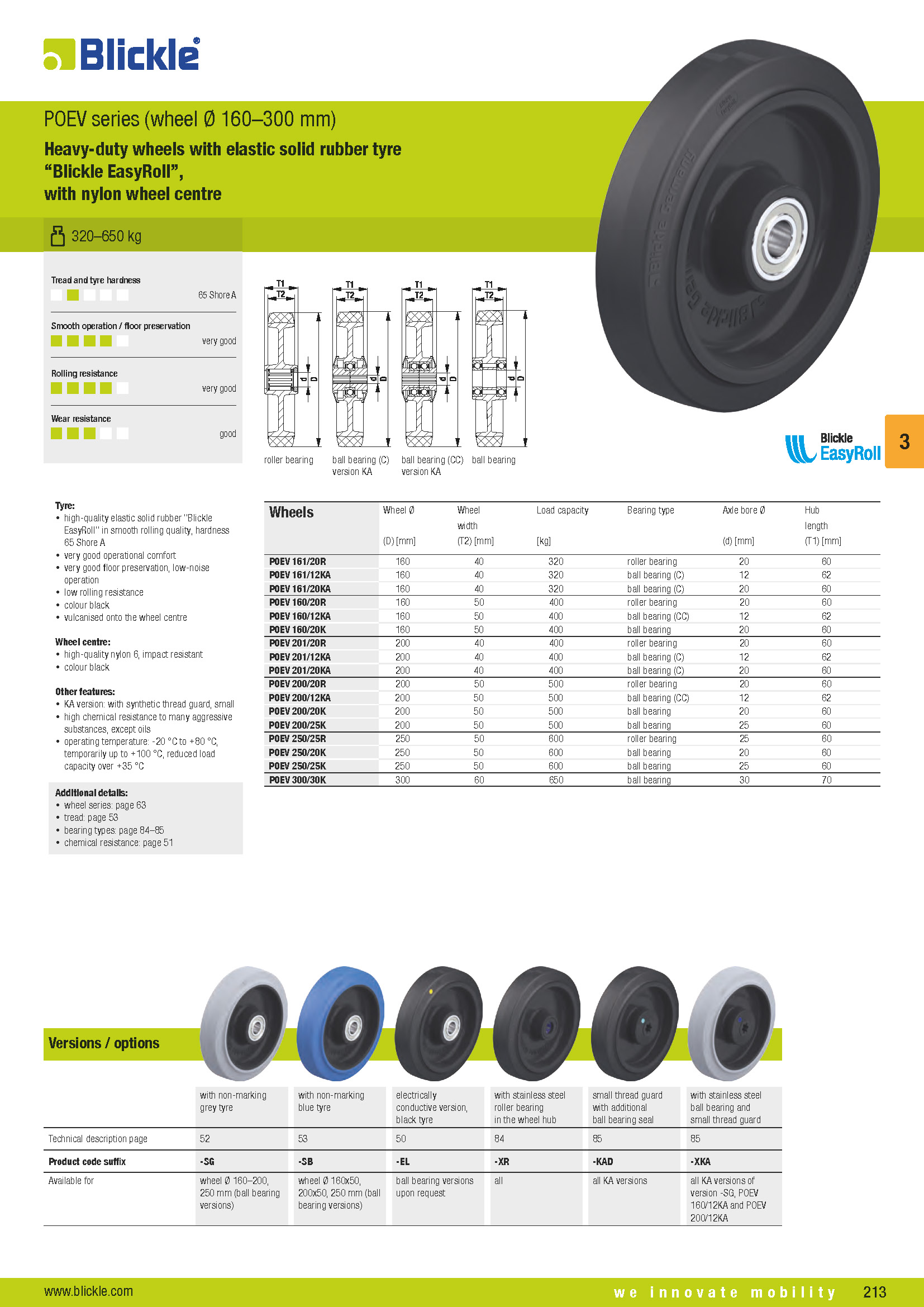POEV (wheel Ø 160–300 mm) Heavy-duty wheels with elastic solid rubber tyre “Blickle EasyRoll”, with nylon wheel centre