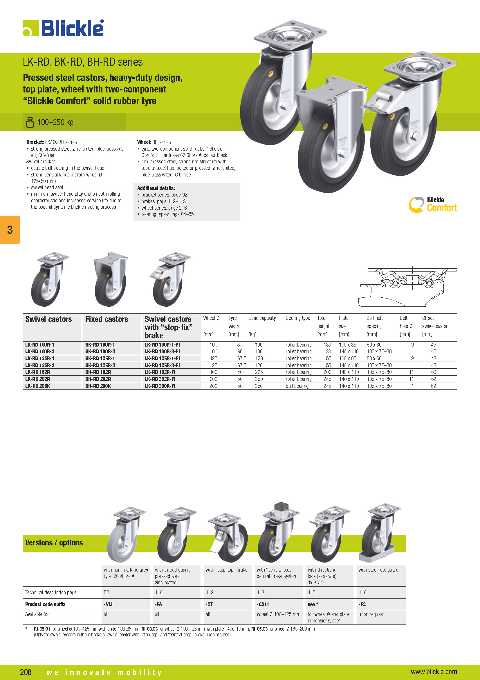 LK-RD, BK-RD, BH-RD Pressed steel castors, heavy-duty design, top plate, wheel with two-component “Blickle Comfort” solid rubber tyre