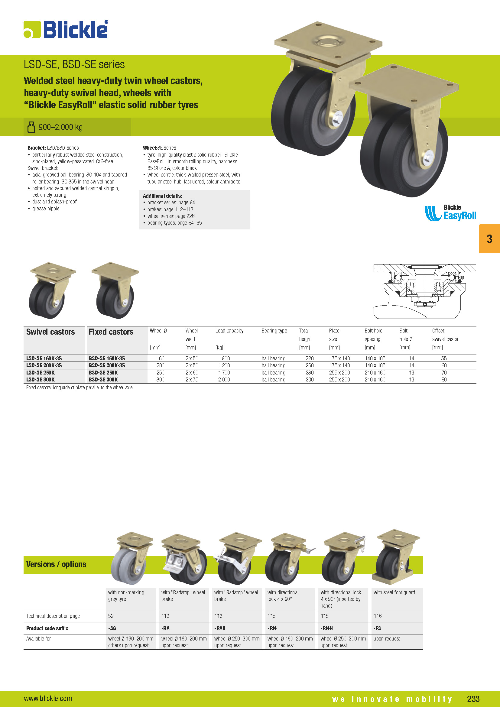 LSD-SE, BSD-SE Welded steel heavy-duty twin wheel castors, heavy-duty swivel head, wheels with “Blickle EasyRoll” elastic solid rubber tyres