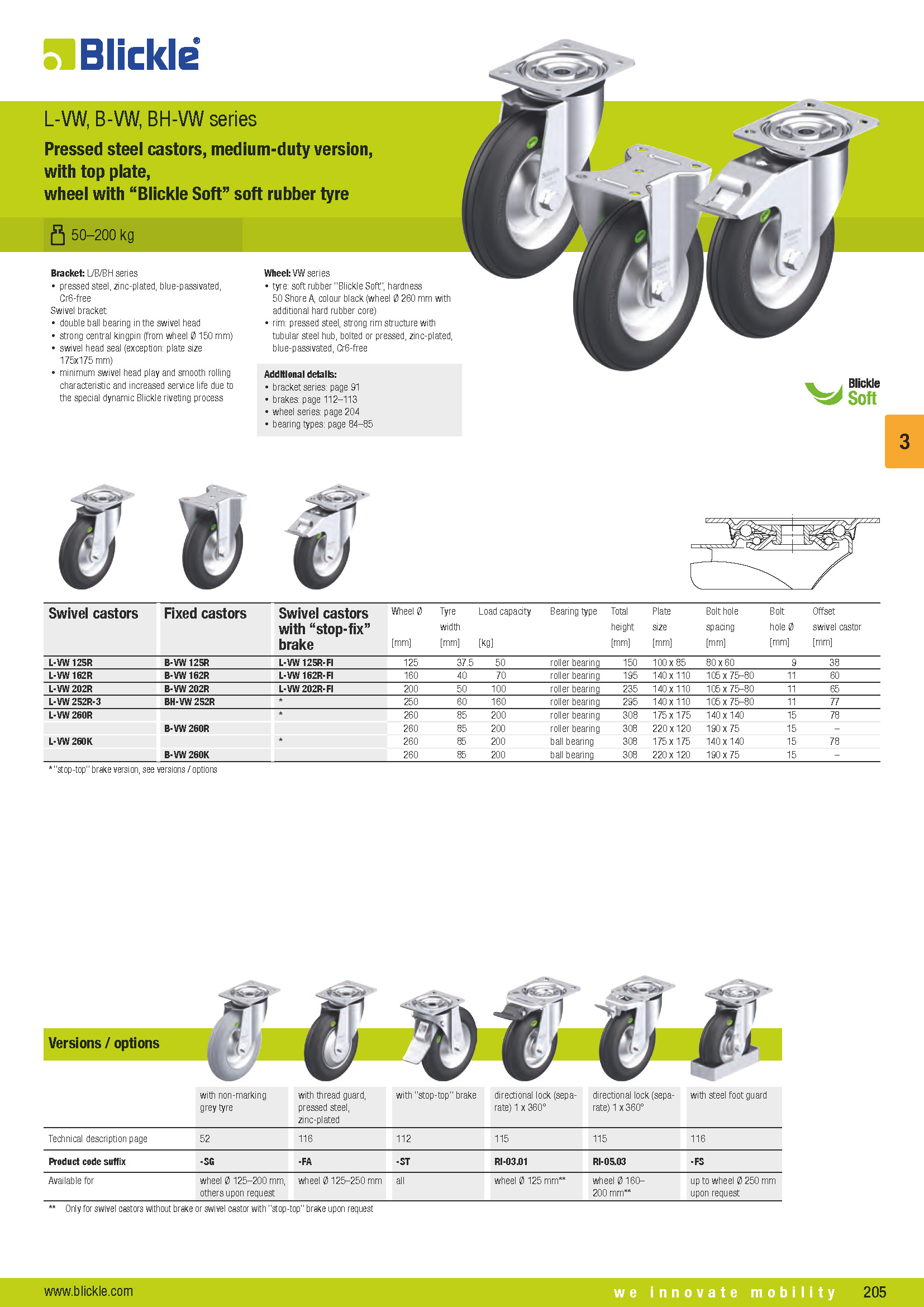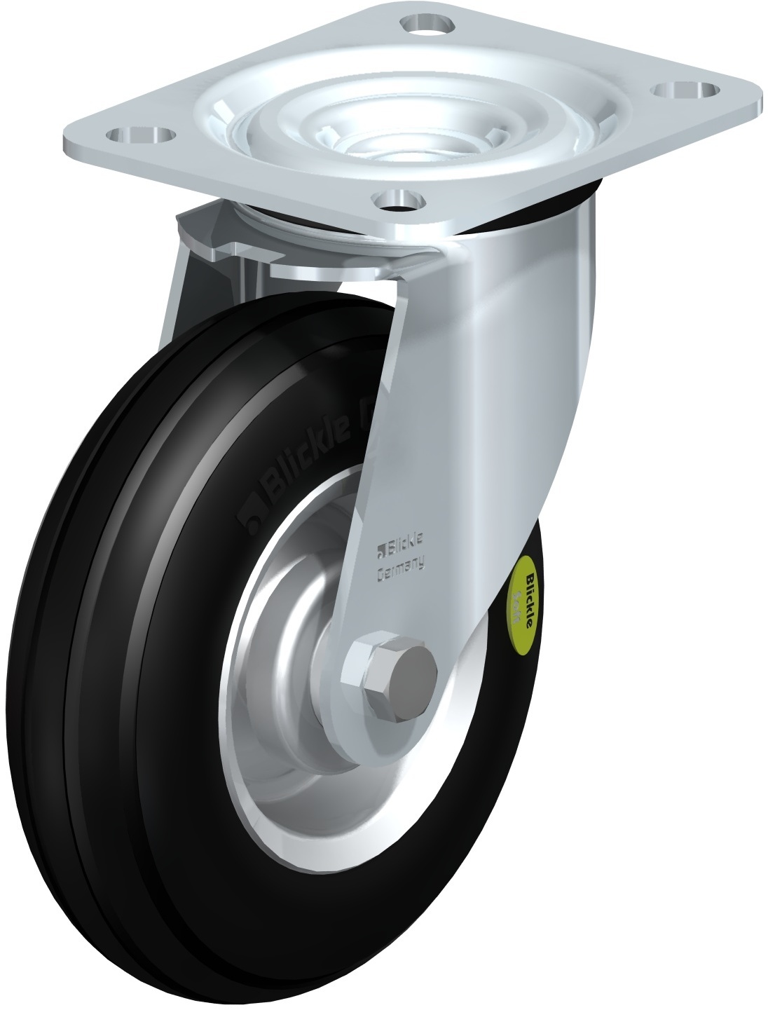 L-VW, B-VW, BH-VW Stahlblech-Rollen, mittelschwere Ausführung, mit Anschraubplatte, Rad mit Weichgummireifen „Blickle Soft“
