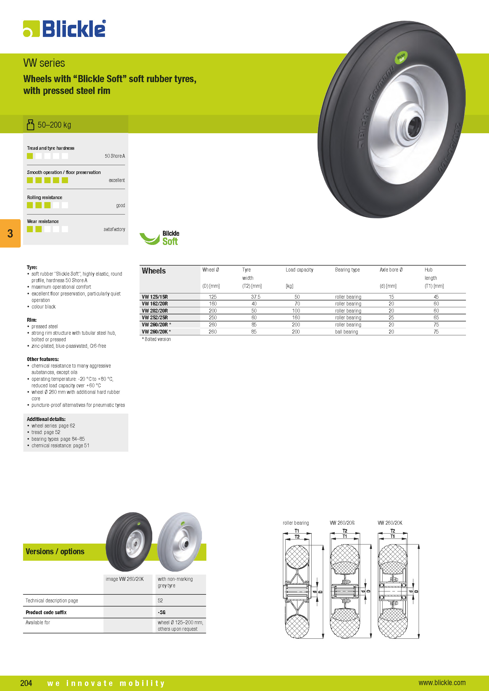 VW Wheels with “Blickle Soft” soft rubber tyres, with pressed steel rim