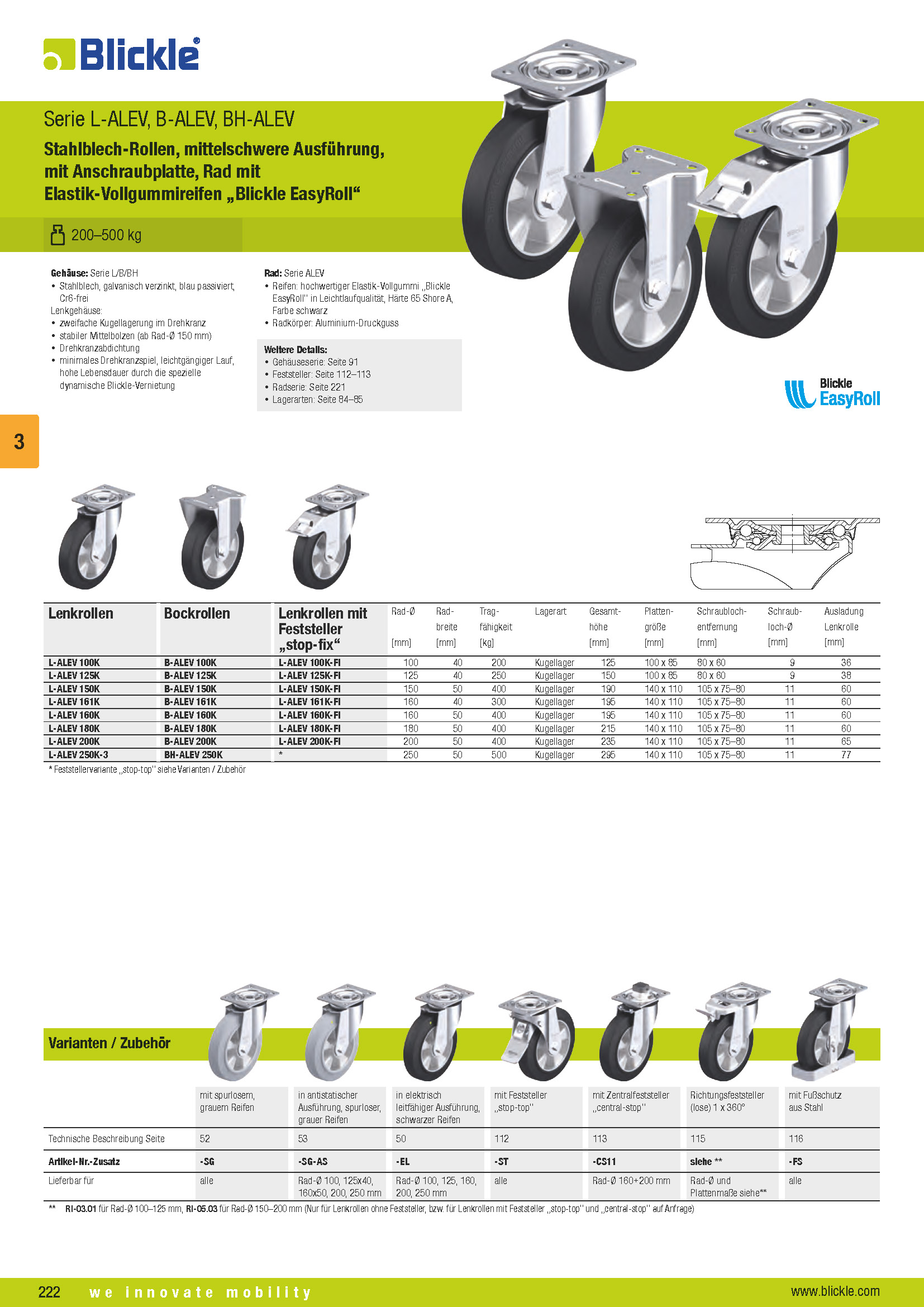 L-ALEV, B-ALEV, BH-ALEV Stahlblech-Rollen, mittelschwere Ausführung, mit Anschraubplatte, Rad mit Elastik-Vollgummireifen „Blickle EasyRoll“