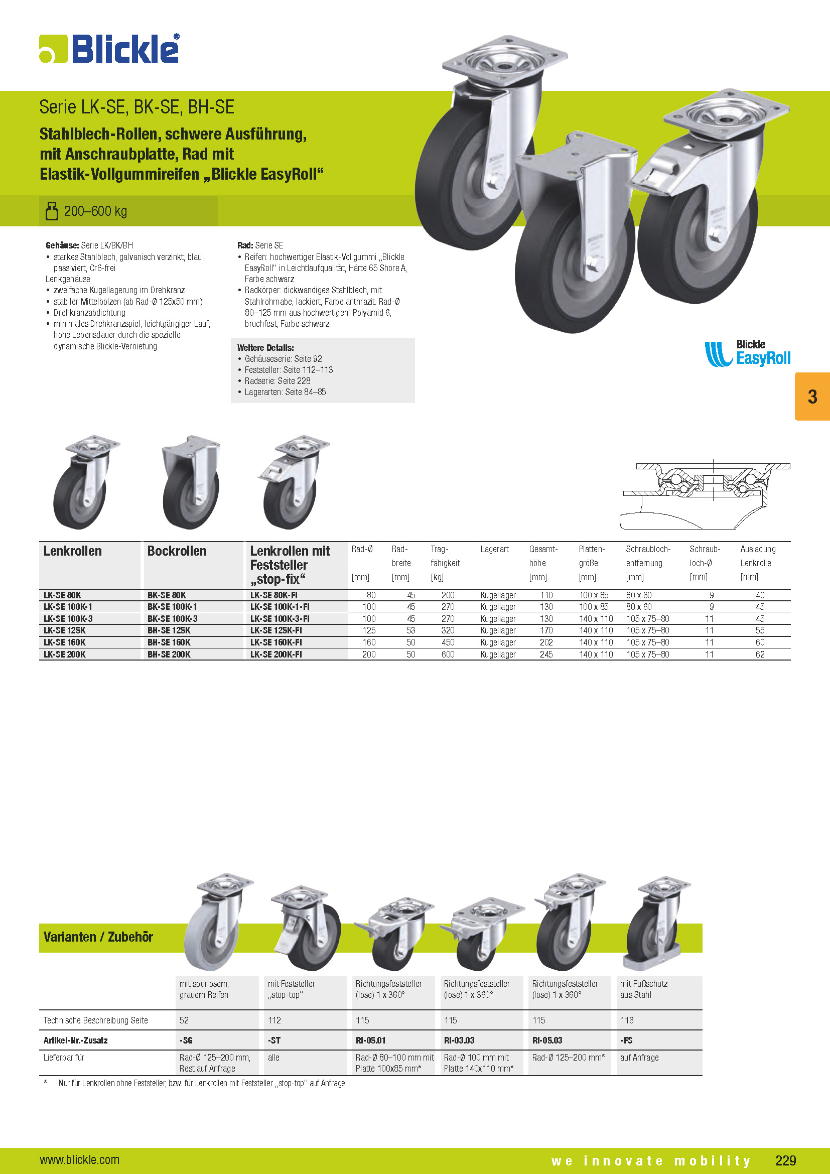 LK-SE, BK-SE, BH-SE Stahlblech-Rollen, schwere Ausführung, mit Anschraubplatte, Rad mit Elastik-Vollgummireifen „Blickle EasyRoll“