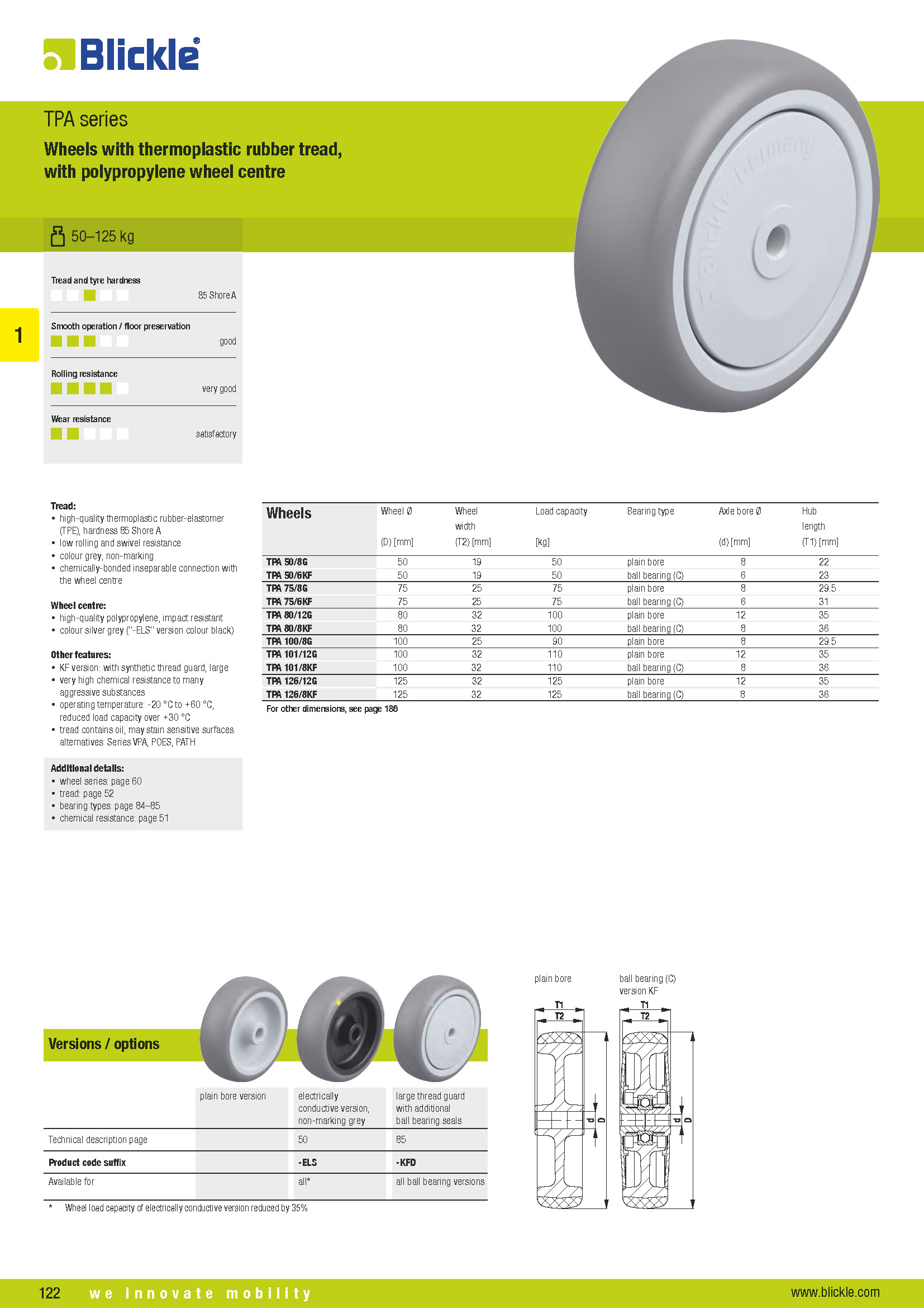 TPA Wheels with thermoplastic rubber tread, with polypropylene wheel centre