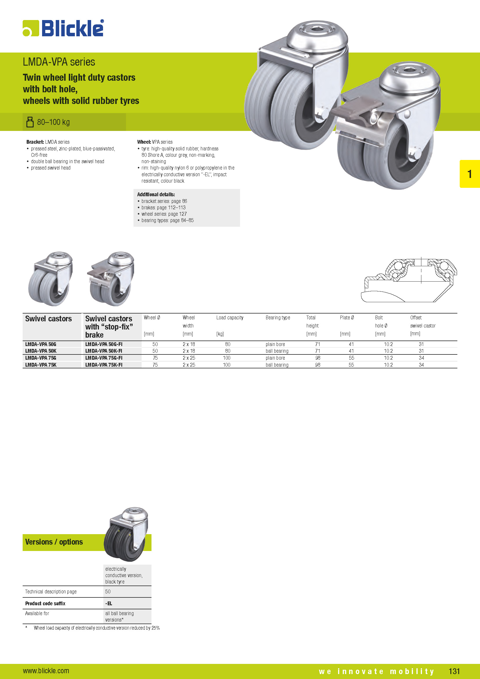 LMDA-VPA Twin wheel light duty castors with bolt hole, wheels with solid rubber tyres