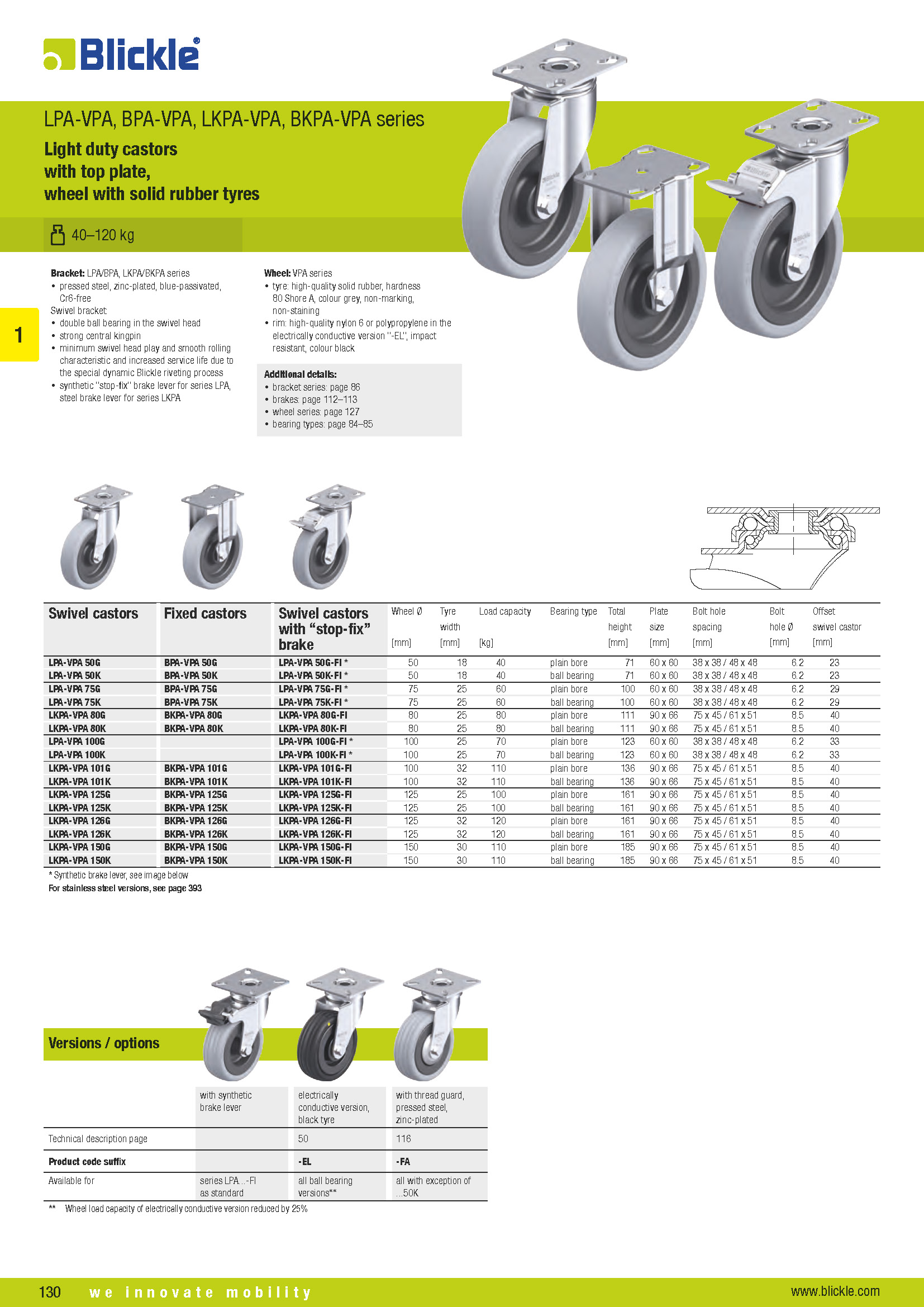 LPA-VPA, BPA-VPA, LKPA-VPA, BKPA-VPA Light duty castors with top plate, wheel with solid rubber tyres